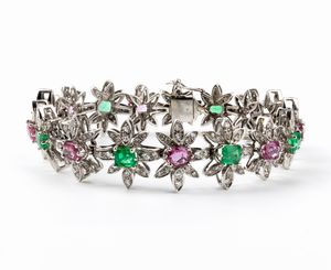 Bracciale con linea di motivi a fiore in oro bianco con diamanti, smeraldi e rub [..]