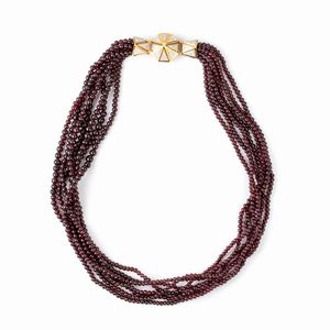 Collana a 7 fili di sfere di granato, oro e diamanti