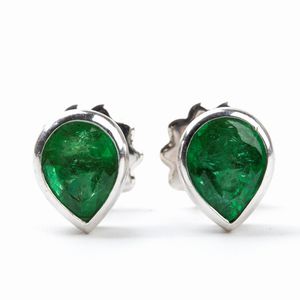 in oro bianco 18k, incastonati con smeraldi. N. 02 smeraldi, forma a goccia, taglio composito, circa 4.40 ct totali. [..]