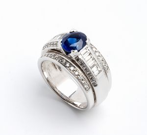oro bianco 18k, Incastonato con zaffiro ovale contornato da nastri in diamanti baguette ad affiancato da brillanti. [..]