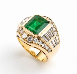 modellato come una fascia, incastonato con smeraldo affiancato da diamanti taglio tapered e contornato da brillanti. [..]