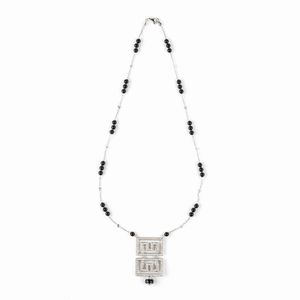 in oro bianco 18k, con catena a maglia forzatina interrotta da piccole sfere di onice, al centro è sospeso un [..]