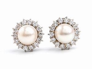 ciascuno con perla coltivata d'acqua salata incorniciata da brillanti.  N. 28 diamanti, forma rotonda, taglio [..]