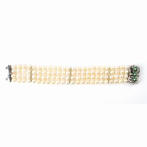 a quattro fili di perle coltivate d'acqua salata con chiusura in oro bianco 18k con tre motivi a fiore in smeraldi [..]