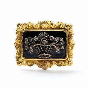 di forma rettangolare, pasta vitrea centrale con motivo di cesto di fiori in argento, tra cornice in oro giallo. [..]