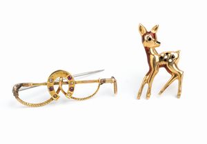 una spilla scaramantica con motivo di ferro di cavallo, piccoli diamanti a rosa e rubini; una spilla raffigurante [..]