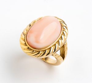 incastonato con cabochon ovale di corallo 'Deep Sea' (corallium laauense) tra godronatura che ne forma il castone. [..]