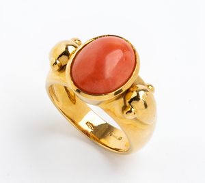 in oro giallo 18k, decorato con cabochon di corallo Cerasuolo ( Corallium Eliatus ). Punzonato '750 - 2886 AL'. [..]