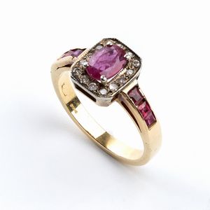 in oro giallo ed oro bianco 18k, incastonato con rubino incorniciato da diamanti. N. 01 rubino di forma ovale, [..]
