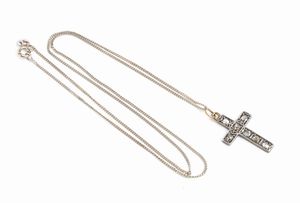 croce pendente in argento ed oro basso titolo incastonata con diamanti taglio a rosa, catena in oro bianco 18k. [..]