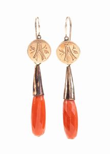 ciascuno con goccia di corallo Mediterraneo (corallium rubrum) . Lunghezza 5,2 cm. Peso complessivo 5,2 gr. Stato [..]