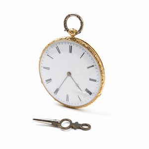 inizio XIX secolo Cassa in oro cesellata con un paesaggio lungo un fiume, quadrante in smalto bianco con numeri [..]