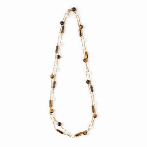 collana in oro giallo con quarzo occhio di tigre e perle