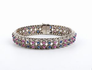 Anni '50 impreziosito da n. 36 rubini di forma rotonda, taglio composito, circa 2.00 ct, e n. 36 zaffiri di forma [..]