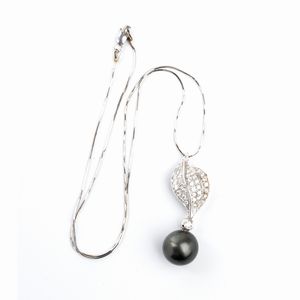 pendente con perla Tahiti sormontata da motivo a foglia in pave' di diamanti. N. 36 diamanti di forma rotonda, [..]