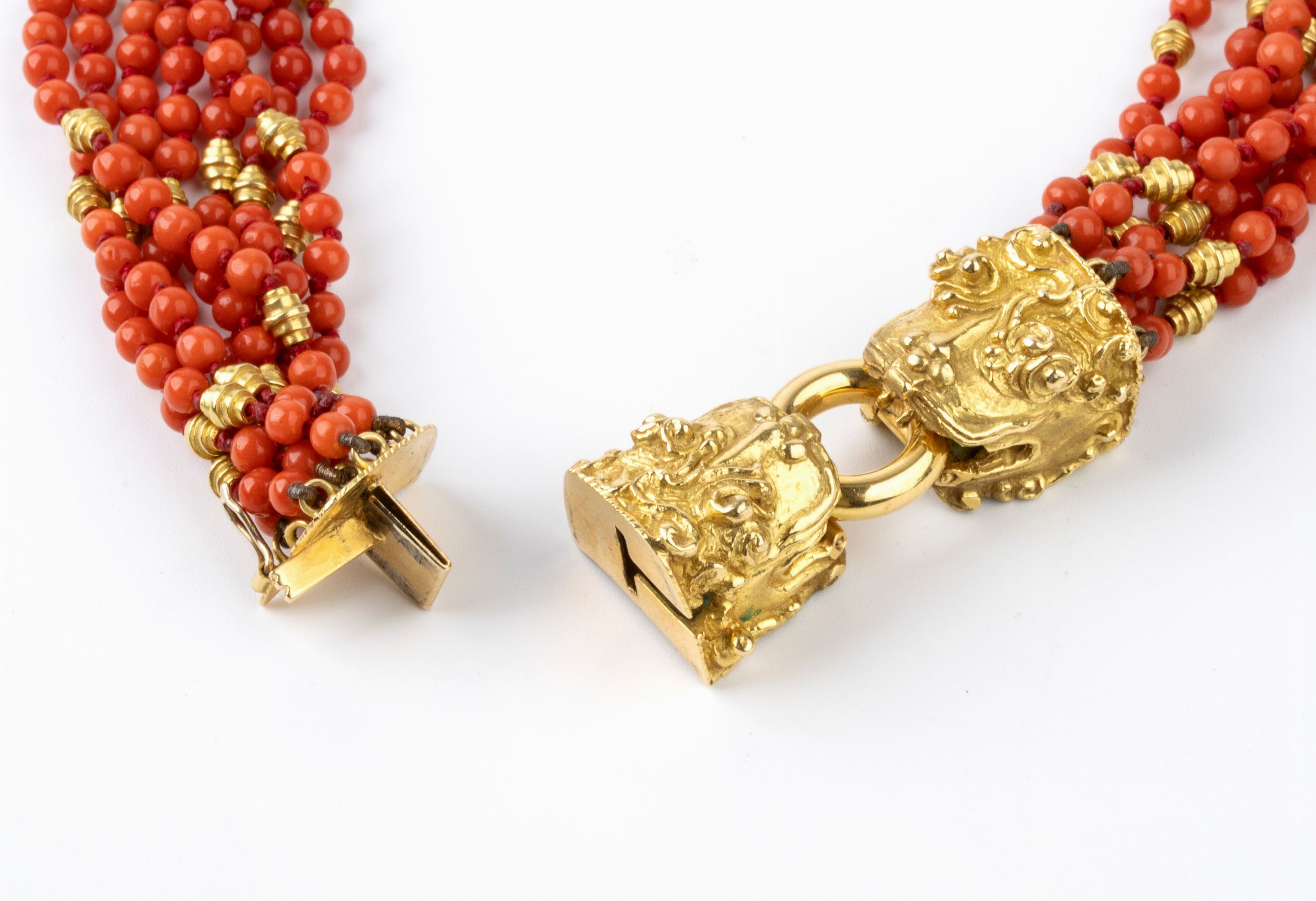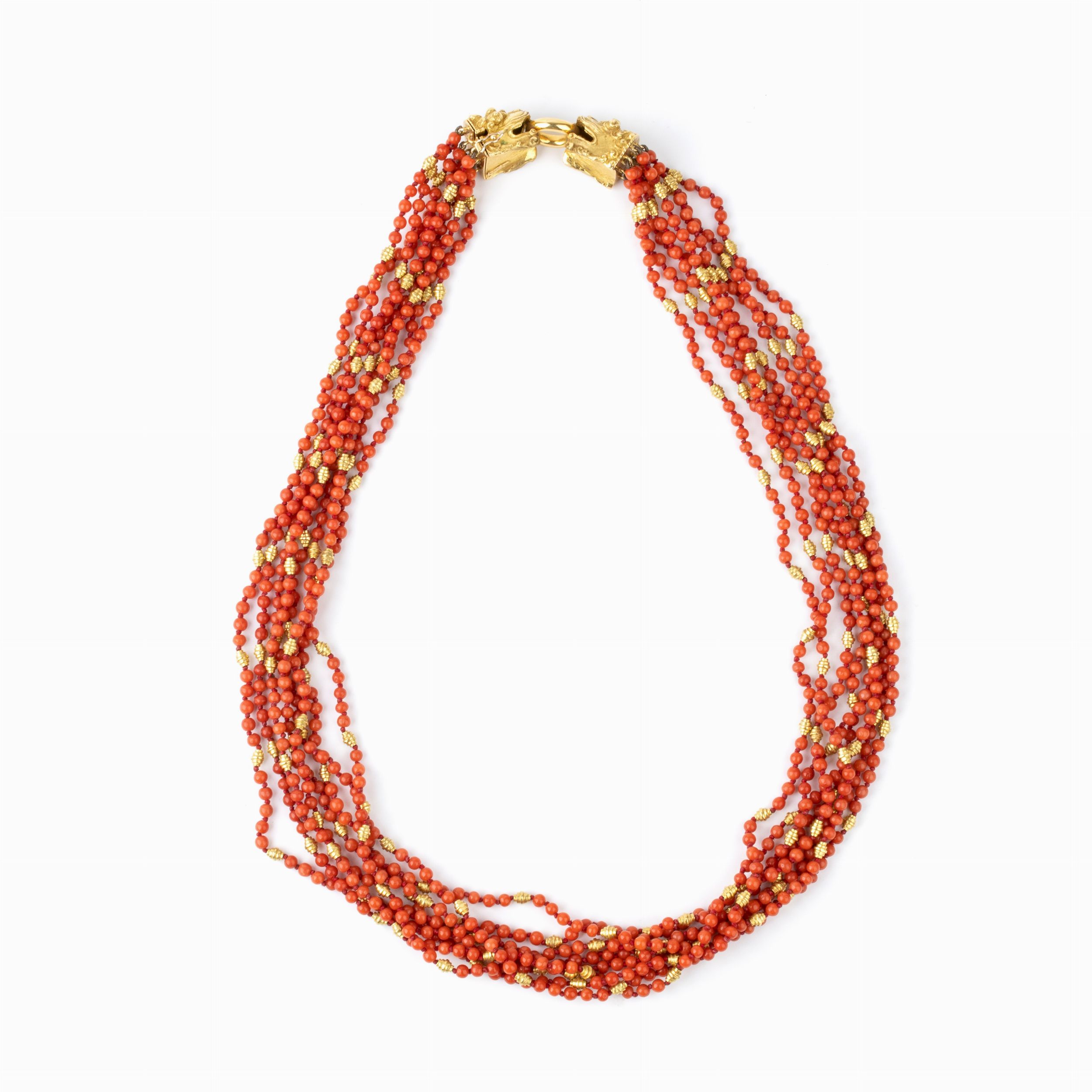 composto da 7 fili di piccole sfere di corallo Mediterraneo (Corallium Rubrum) con fermezza raffigurante due teste di animali fantastici e distanziali in oro giallo 18k. Diametro corallo: 3.5 - 4 mm. Punzonata '750 - G - 2 BO'. Lunghezza: 66,5 cm. Peso 188,8 gr. Stato di conservazione: ***** eccellente.
