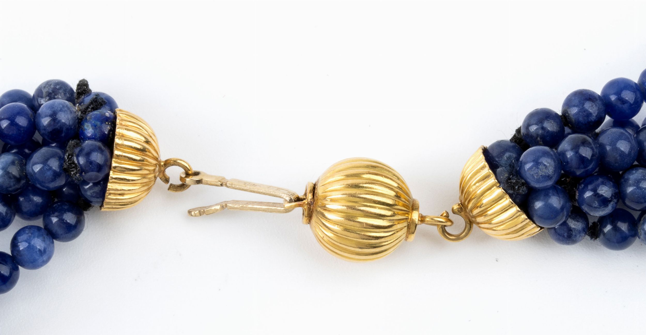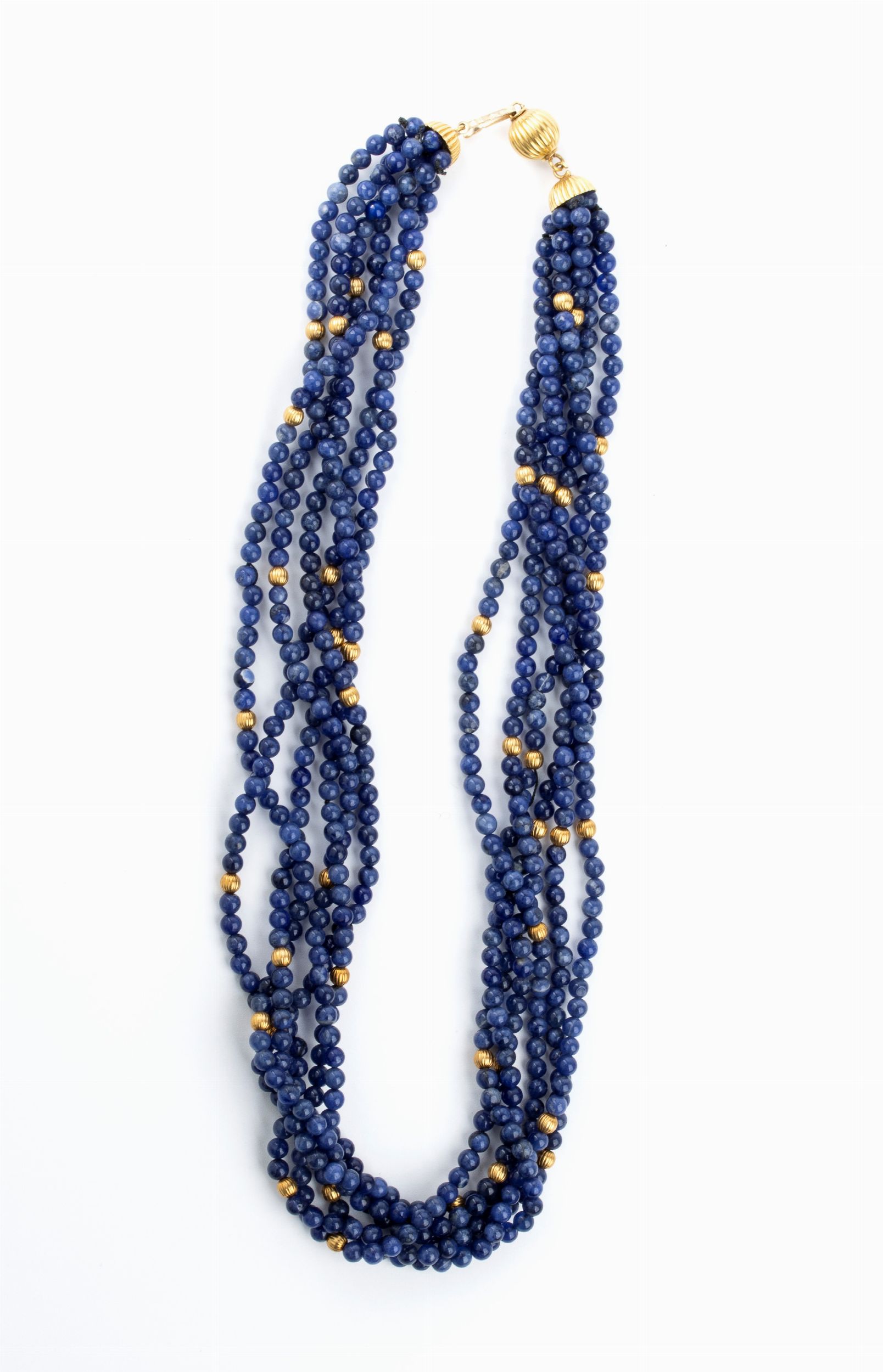 fermezza a scomparsa e distanziali in oro giallo 18k, 6 fili di sfere di sodalite, diametro 4 - 4.5 mm. Punzonato '750 - 31 PR'. Lunghezza: 49 cm. Peso: 68,8 gr. Stato di conservazione: **** good.