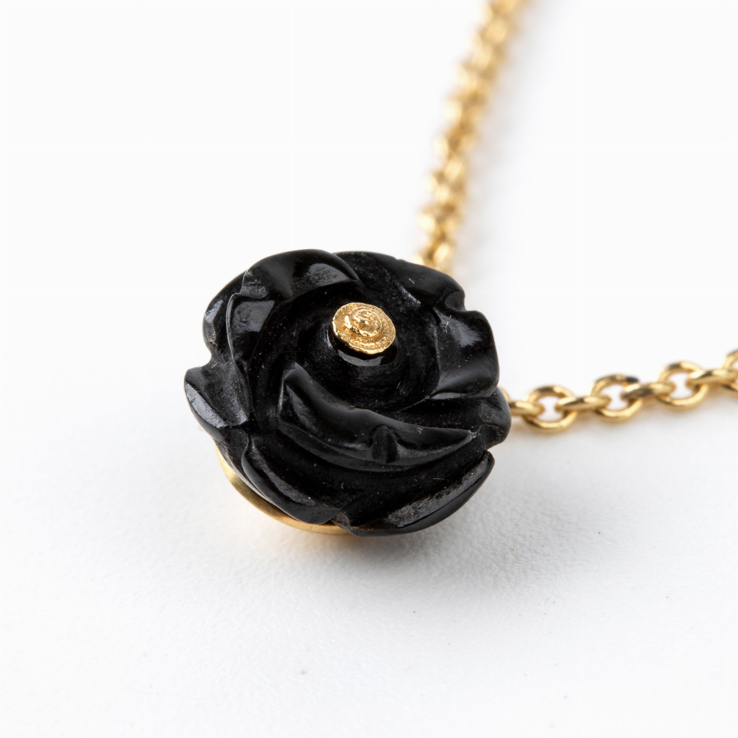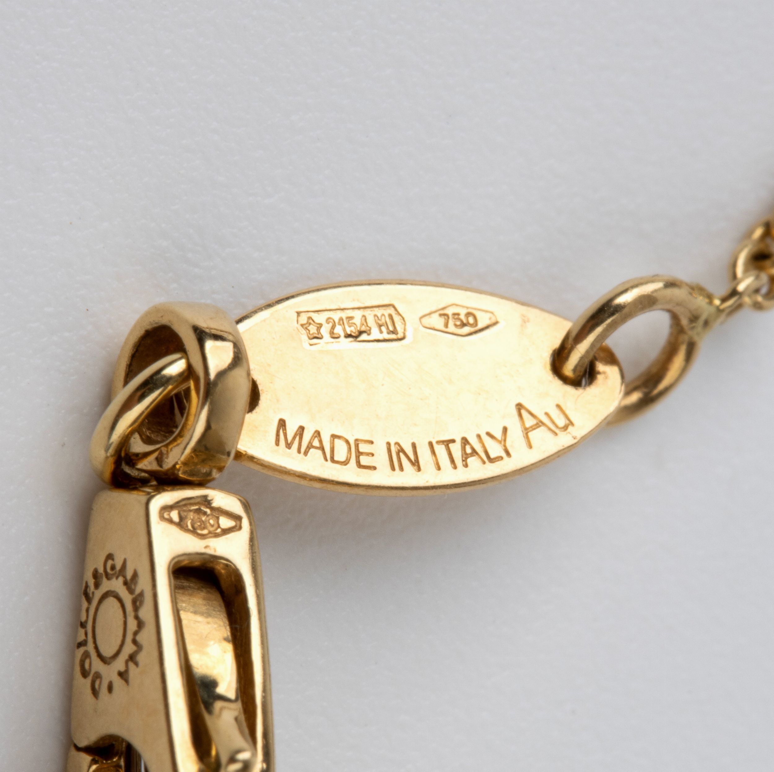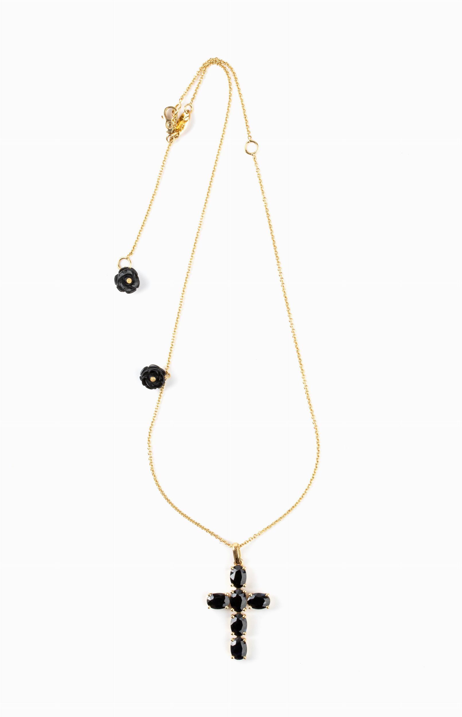 il girocollo è composto da una catena a maglia “rolò” sottile e da due pendenti: una croce latina realizzata con zaffiri neri di forma ovale e una rosa di onice intagliata. Un'altra rosa è stata inserita come terminale nella catena di regolazione. Una targhetta ovale posta tra la catena e la chiusura riporta il logo “DOLCE&GABBANA”. Punzonato '750 - 2154 MI - AU - MADE IN ITALY'. Lunghezza catena: 42 cm. Dimensioni pendente: 3.5 x 2 cm. Peso: 8.9 gr. Stato di conservazione: ***** eccellente.