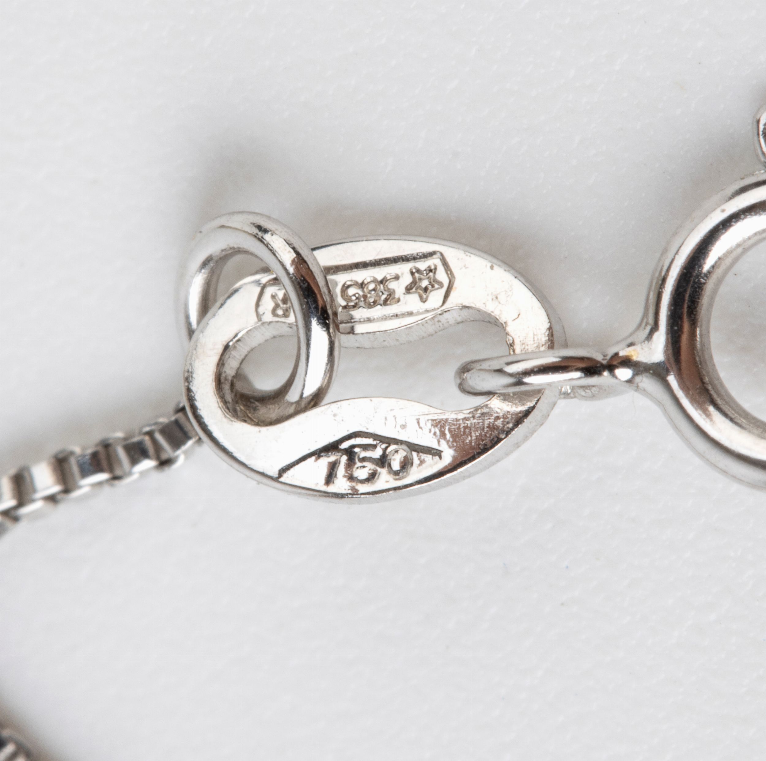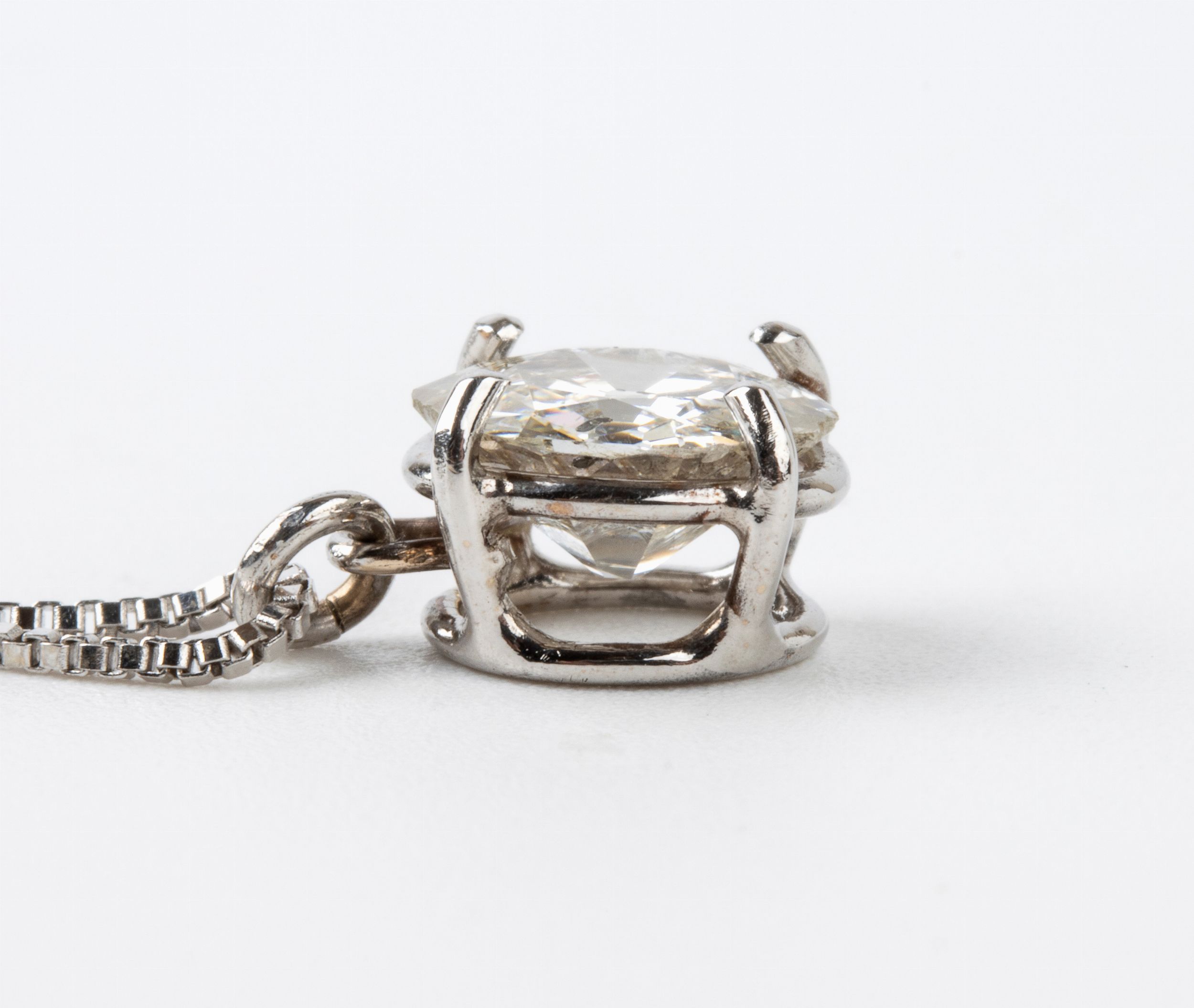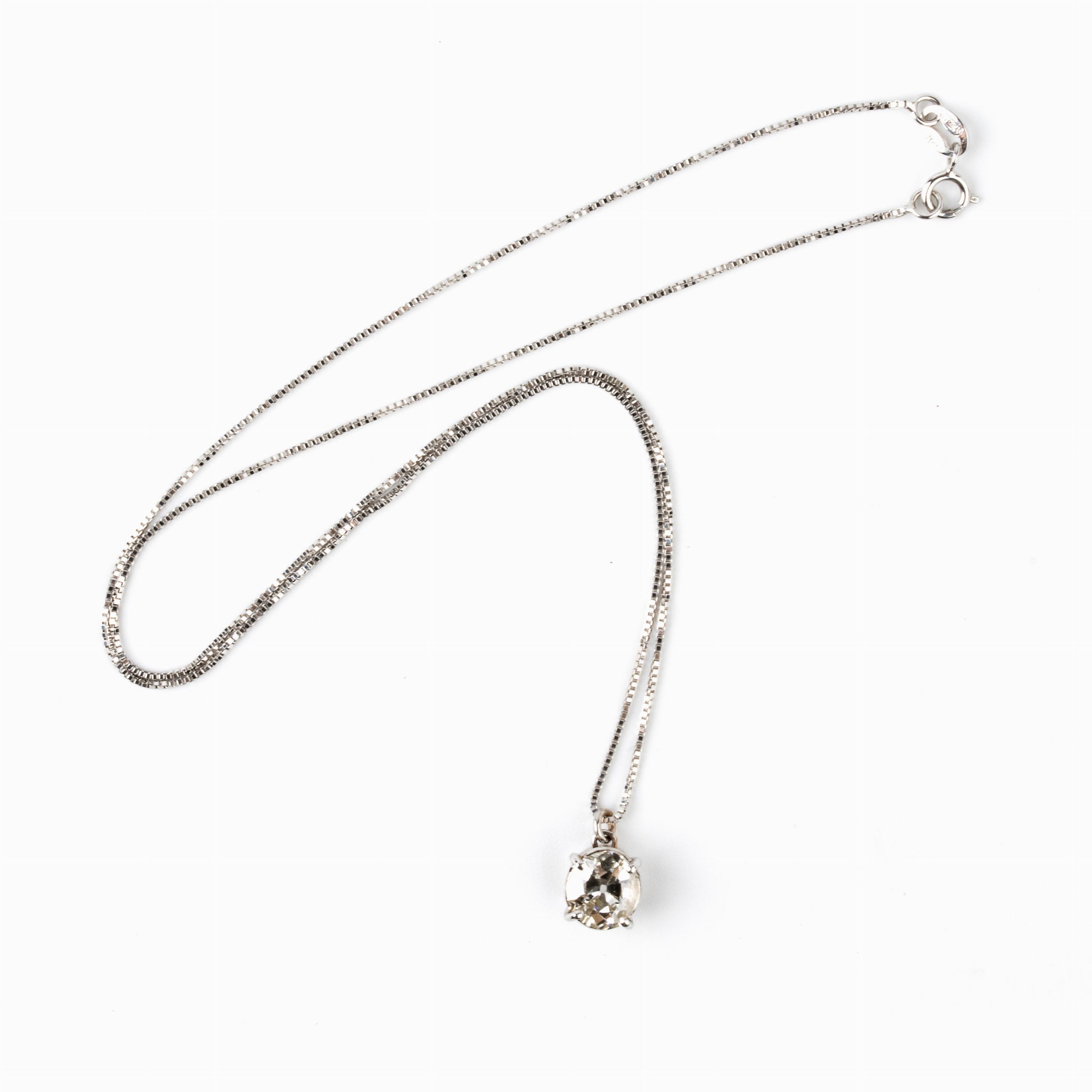 sottile catena a maglia veneziana in oro bianco 18k a cui è sospeso un pendente incastonato con diamante. N. 01 diamante di forma ovale, taglio vecchio europeo, circa 1.00 ct, I, J-K. Punzonato '750 - 385 AR'. Peso: 2,2 gr. Stato di conservazione: **** buono.