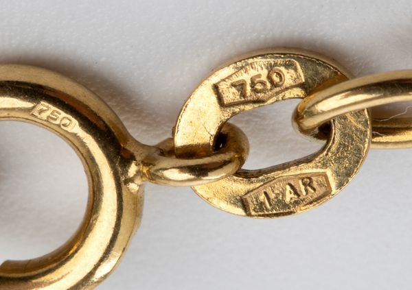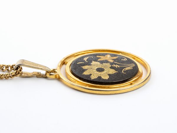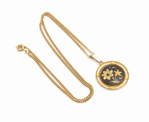 sottile catena a maglia grumetta in oro giallo 18k a cui è sospeso un pendente in metallo con motivo floreale. Punzonato '750' - 1 AR'. Lunghezza catena: 50 cm. Peso complessivo: 16,7 gr. Stato di conservazione: **** buono.