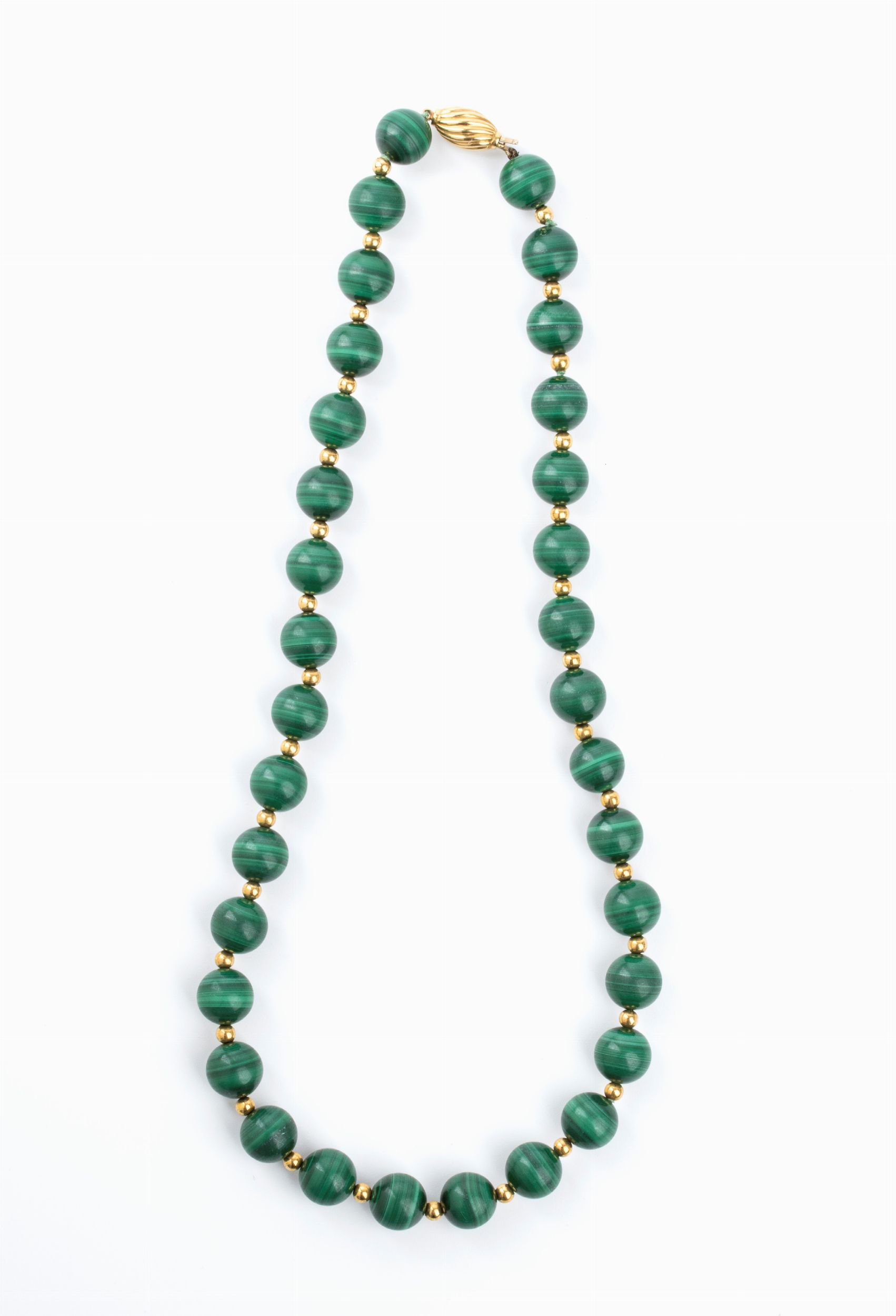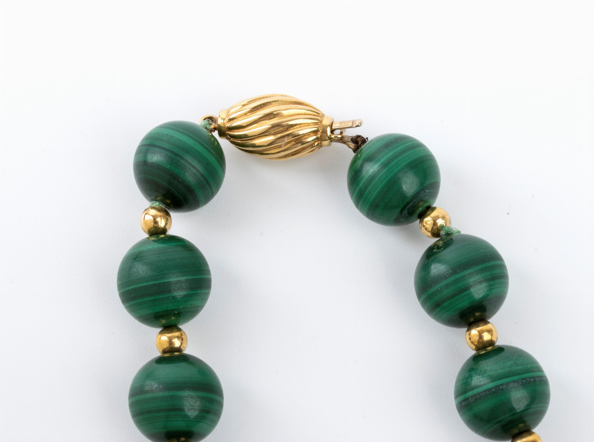Composto da un filo di sfere di malachite separate da piccole sfere distanziali in oro giallo 18k.  Diametro sfere: 12 mm. Lunghezza: 54 cm. Peso: 119,8 gr. Stato di conservazione: **** buono.