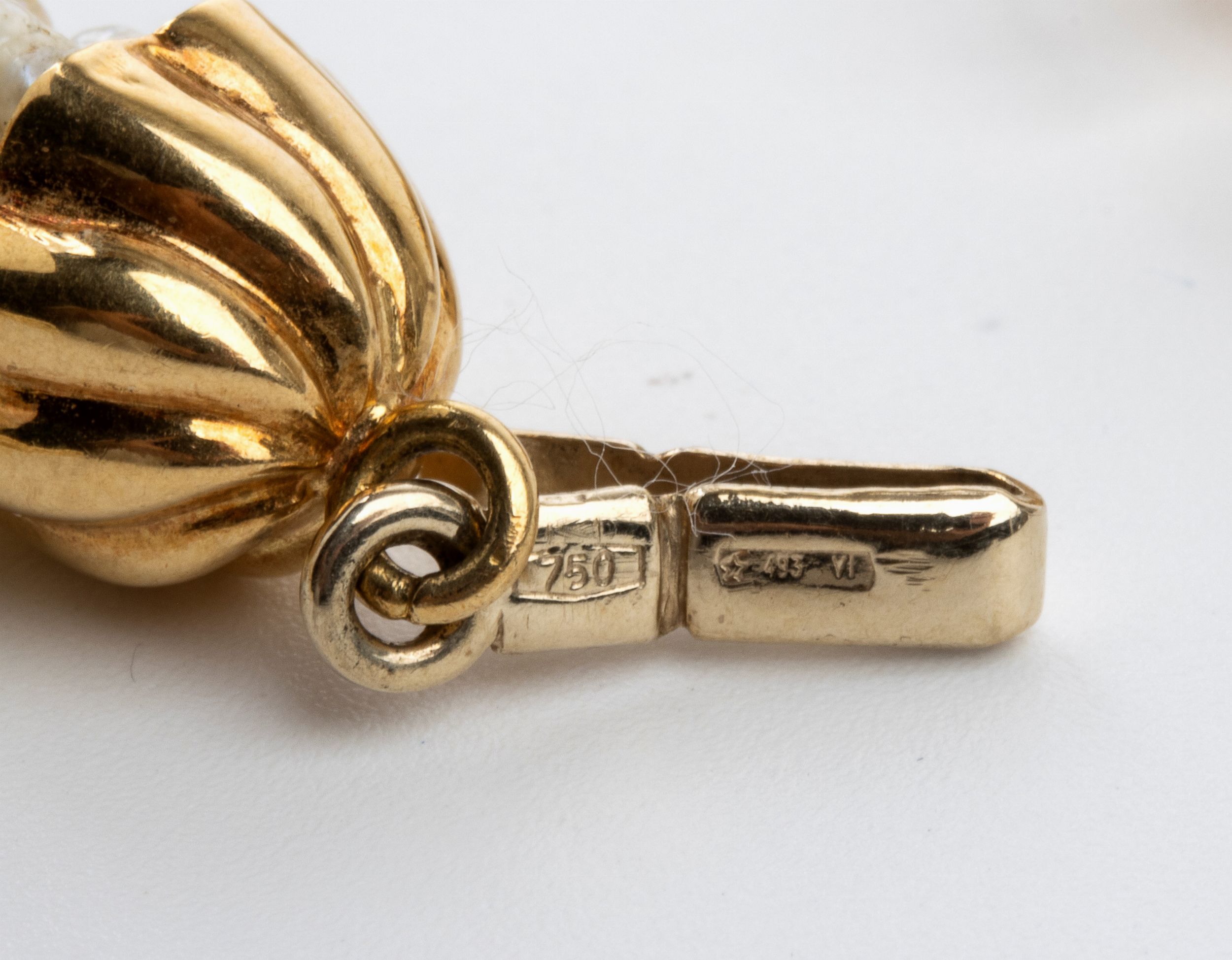 torsade a sette fili di perle coltivate d'acqua salata con fermezza in oro giallo 18k.  Punzonata '750 - 493 AL'. Lunghezza: 46,5 cm. Peso: 36,6 gr. Stato di conservazione: **** buono.