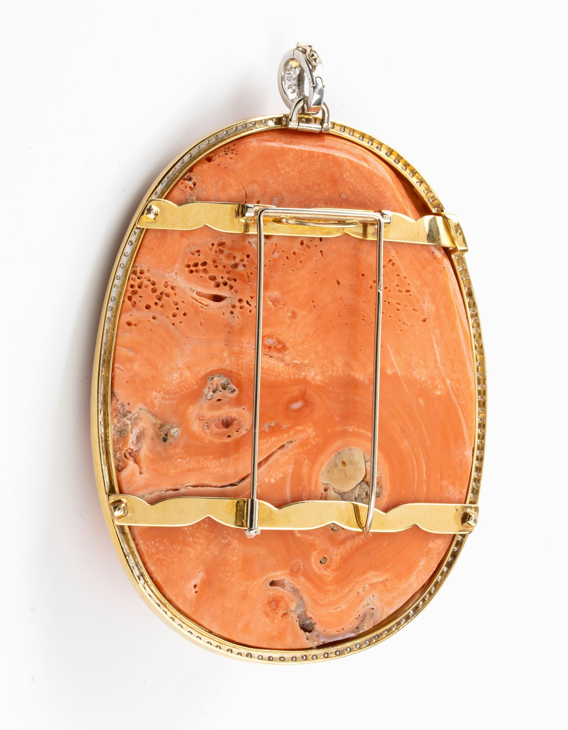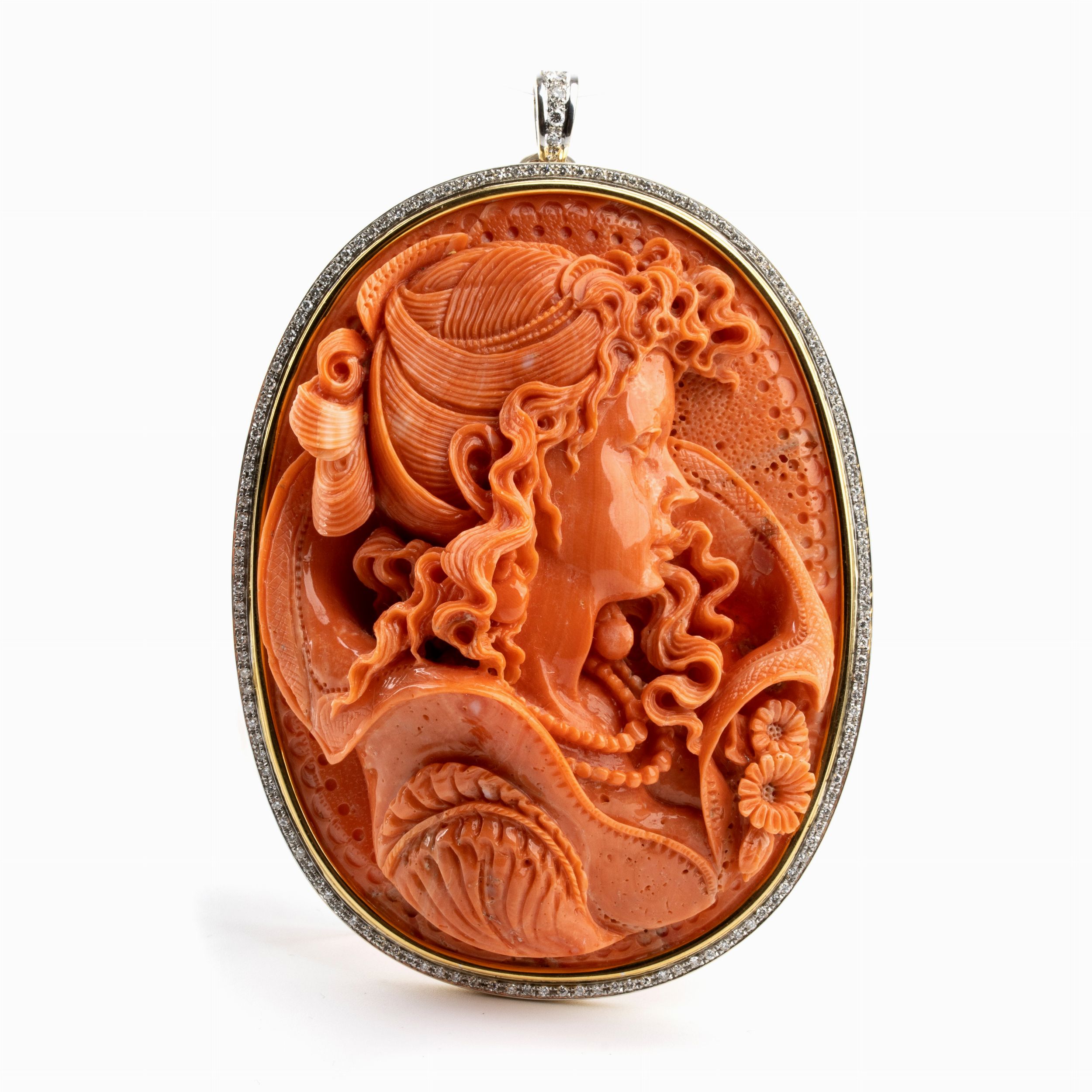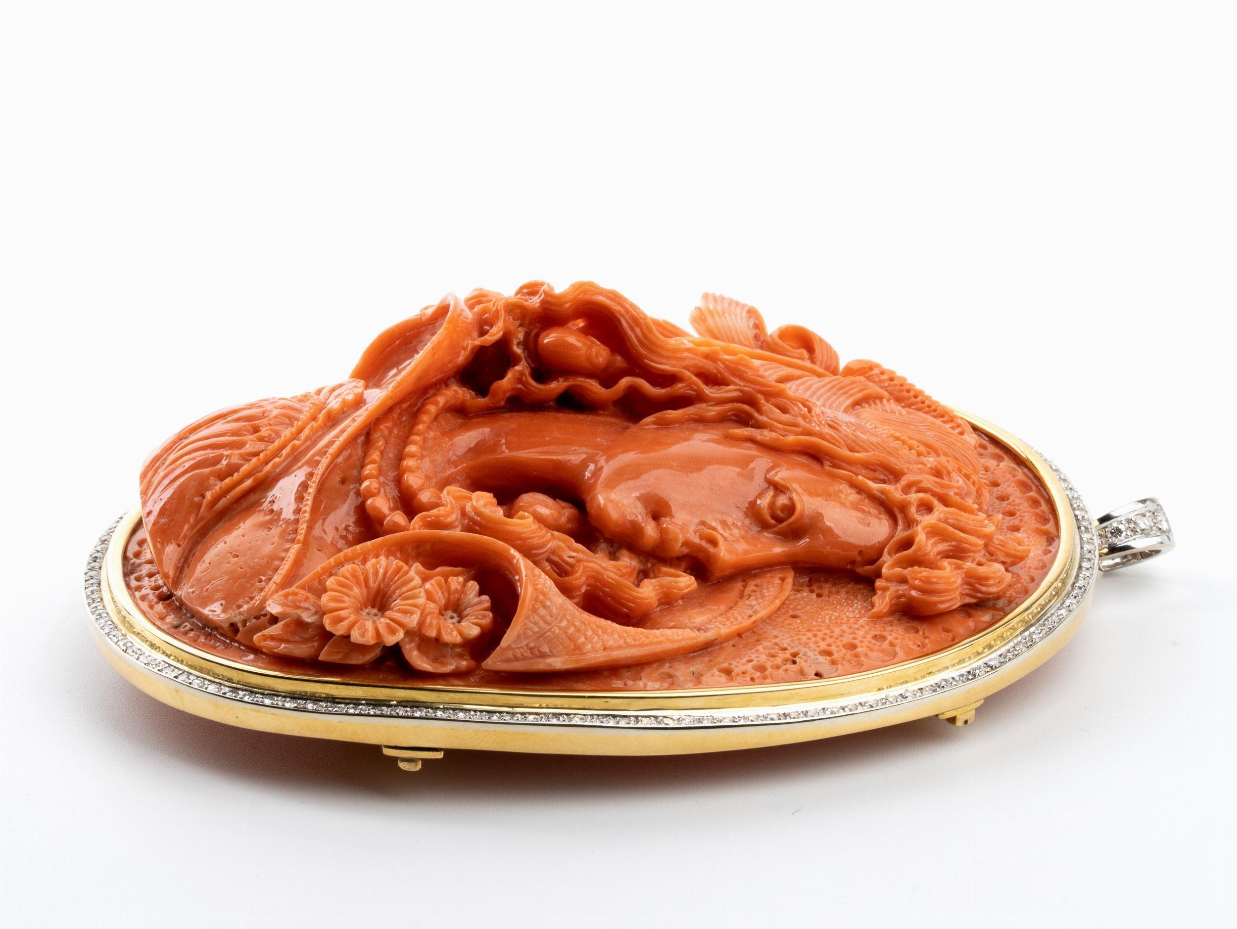 con cammeo scolpito in corallo Cerasuolo ( Corallium Eliatus ) raffigurante il profilo di una nobildonna adornata di gioielli e fiori, inserita in una cornice di diamanti di forma rotonda, taglio brillante per circa 1.50 ct, H-I, VS. Dimensioni: 11,6 x 8 cm. Peso: 222,7 gr. Stato di conservazione: ***** eccellente.