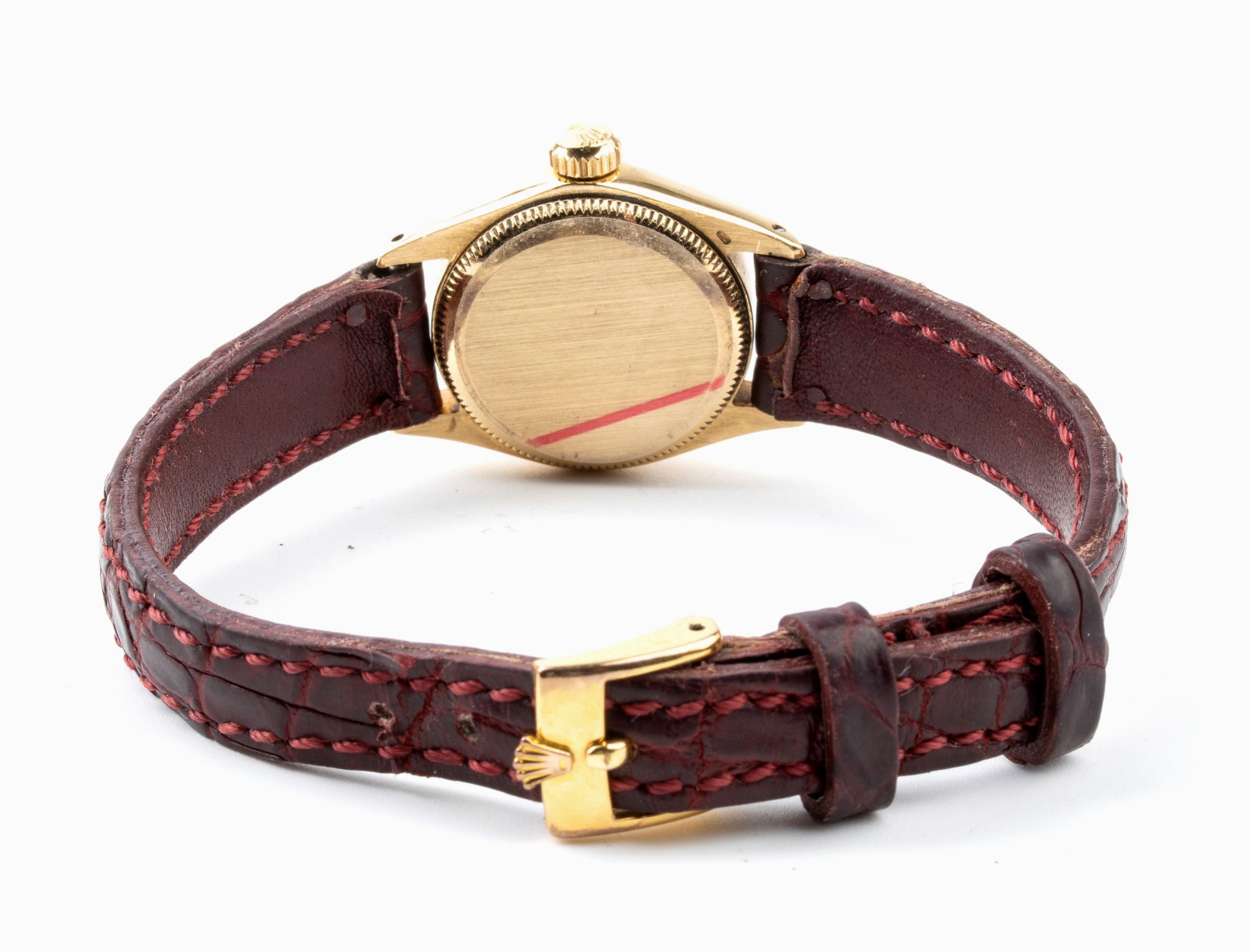1967 Cassa in oro 18k con quadrante con indici a bastone e sfere dritte dorate e vetro plastica. Movimento meccanico a carica automatica calibre 1161. Numero di referenza 6618, numero di serie 1603953, risalente al 1967. Cinturino in pelle con fibbia Rolex placcata in oro. Dimensioni cassa 24 mm. Peso 30,70 gr. Stato di conservazione: **** buono, attualmente funzionante.