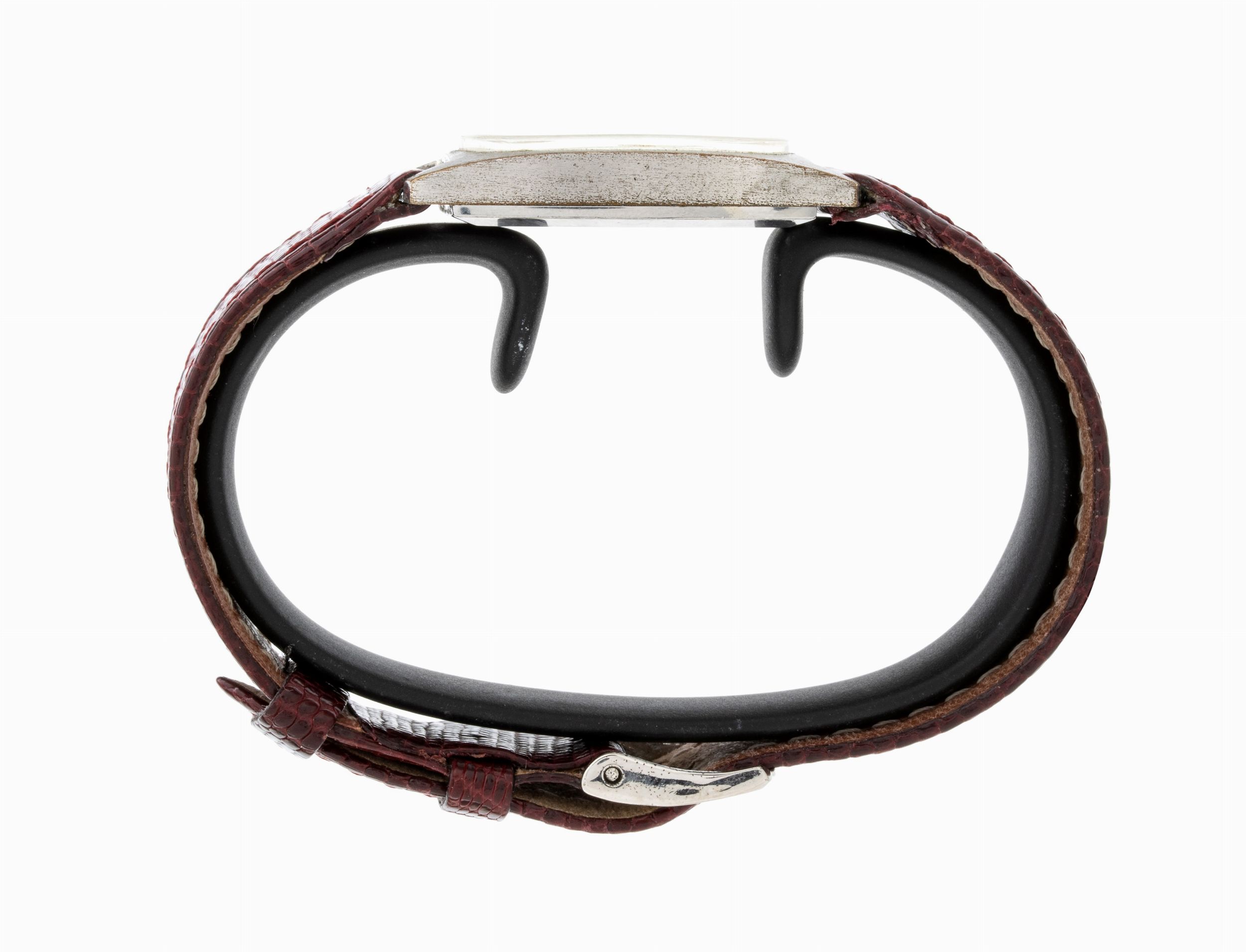 Anni '70 cassa di forma rettangolare in acciaio con quadrante bianco e indici romani, datario ore 6, movimento meccanico a carica manuale. Dimensioni cassa: 35 x 25 mm. Peso lordo: 24 gr. Stato di conservazione: **** buono, segni di usura dovuti al tempo.
