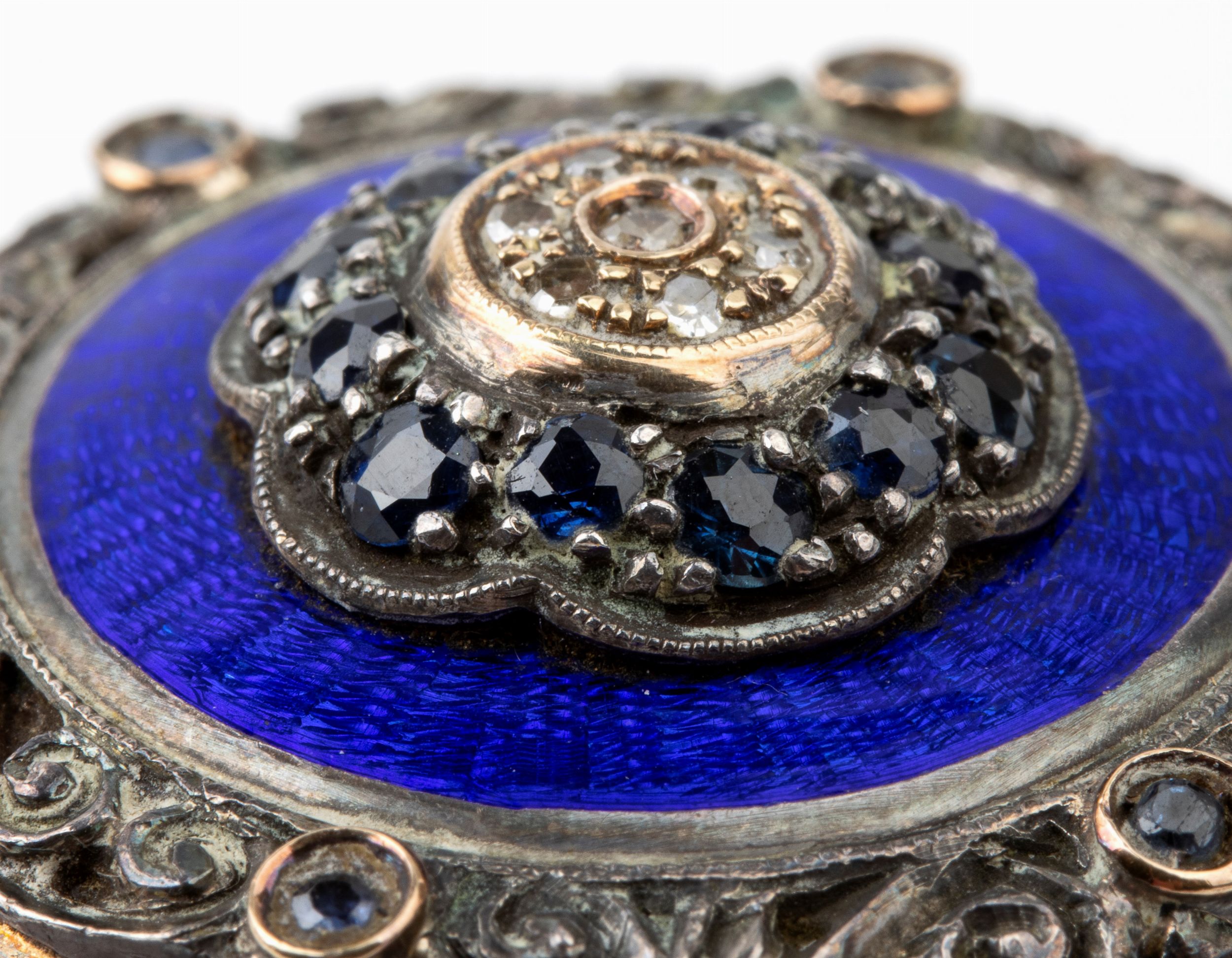 Anni '70 Cassa savonette in oro 18K e argeento decorata con smalti guillochè e incastonata con zaffiri, diamanti taglio huit-huit e perle fiume, quadrante dorato con numeri romani entro lunette in smalto bianco e sfere dorate firmato 'Dressler 17 Rubies'. Movimento con scappamento ad ancora e carica a remontoir. Punzonato '750 - * 2078 AL'. Diametro cassa: 30 mm. Peso lordo complessivo: 44 gr. Stato di conservazione: **** buono, attualmente funzionante.