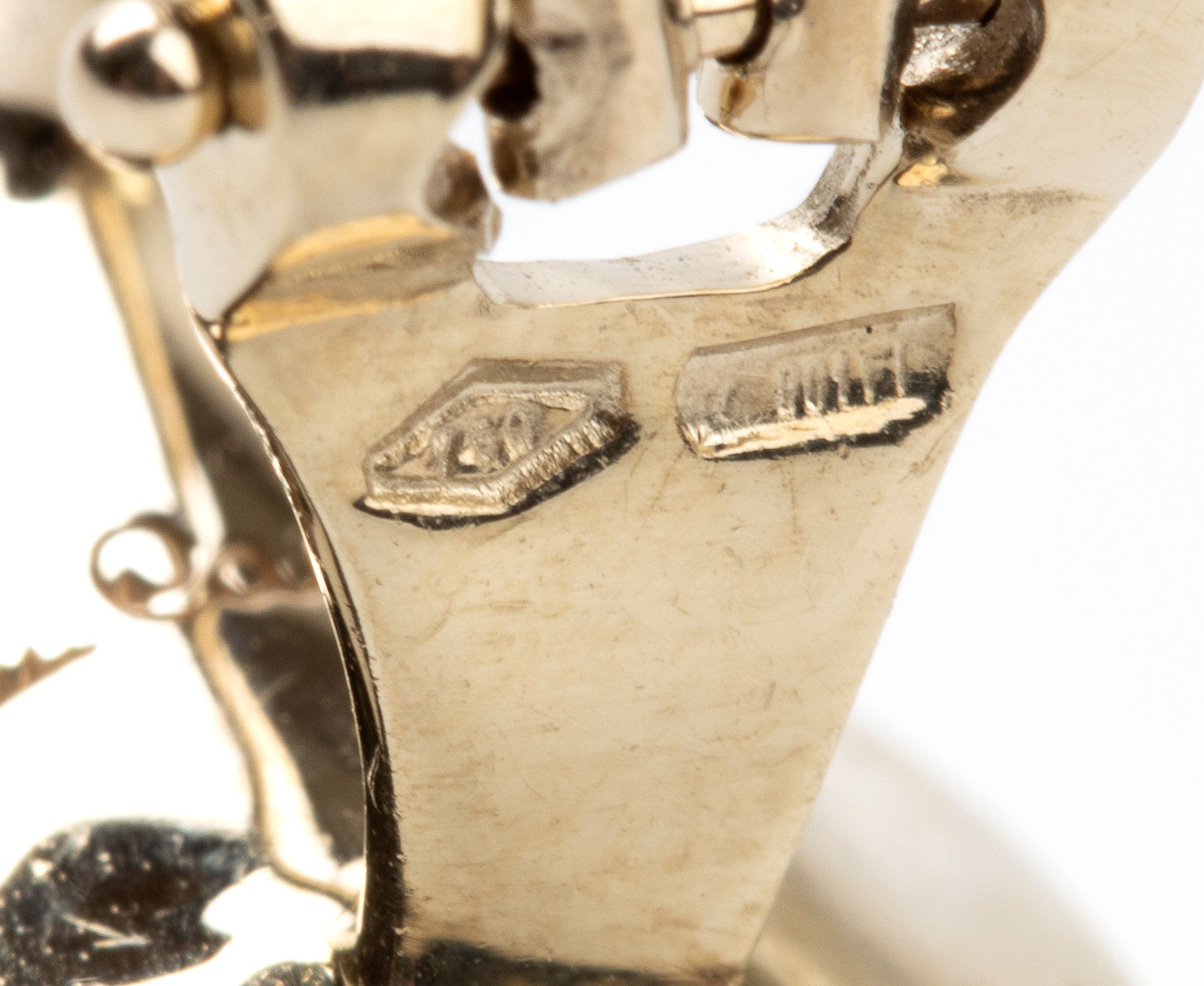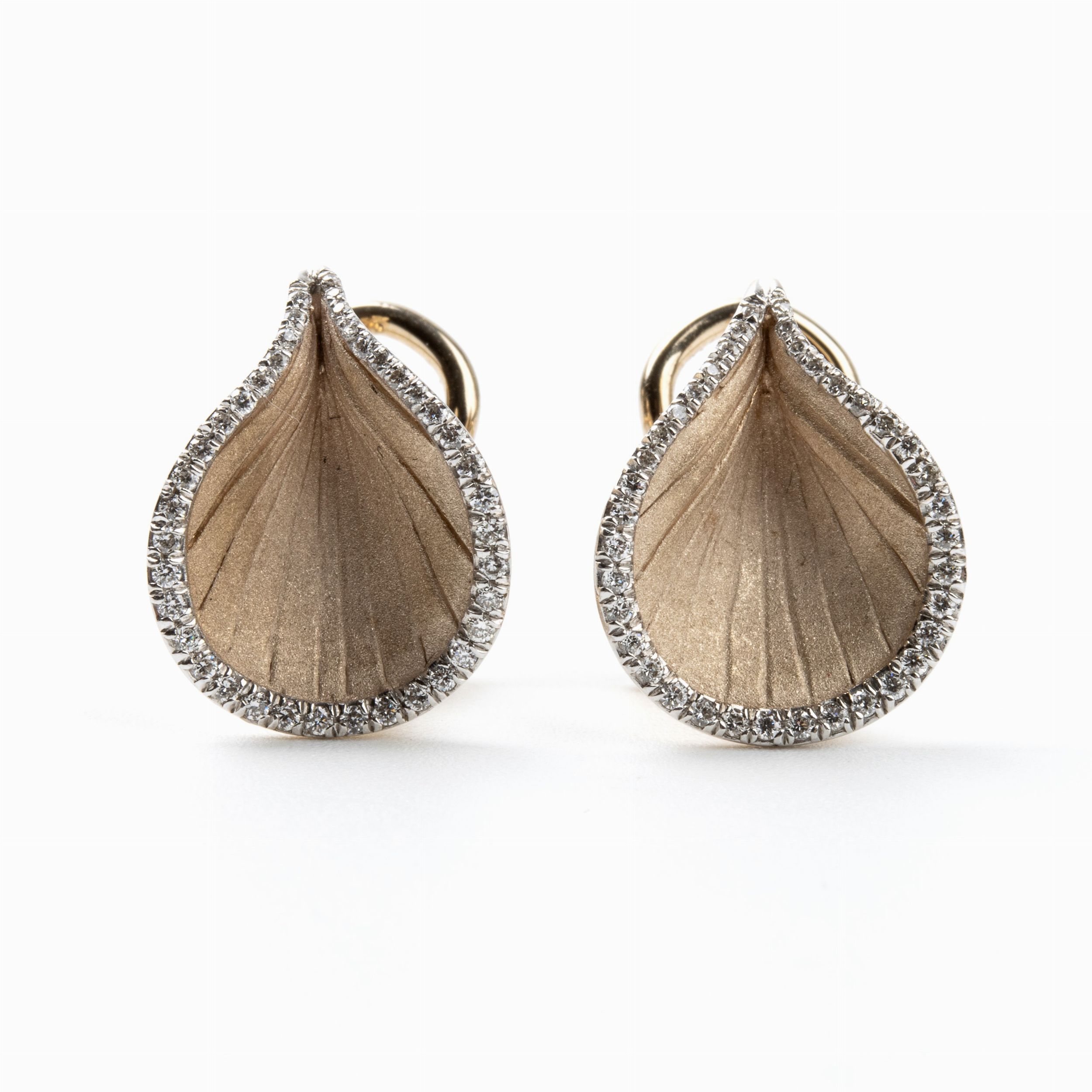 in due colori d'oro 18k, superficie concava con finitura satinata e filettata tra cornice di diamanti taglio brillante per circa 0.40 ct totali. Firmata 'Ann. Cammilli'. Punzonato '750 - 901 FI'. Dimensioni fronte: 1.5 x 1.1 cm. Peso: 4.8 gr. Stato di conservazione: ***** eccellente.