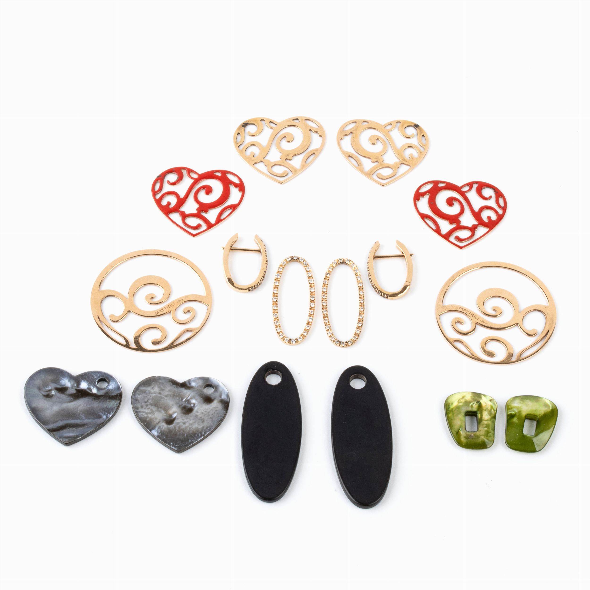 in oro giallo 18k, parti smaltate, incastonati con diamanti; Firmato MATTIOLI, con scatola originale. con due coppie di elementi in madreperla di vari colori, ed una coppia di elementi in onice intercambiabili. N. 24 diamanti di forma rotonda, taglio brillante, colore fantasia marrone, circa 0.24 ct, e n. 58 diamanti di forma rotonda, taglio brillante, circa 0.58 ct, G-H, VS. Punzonato '750 - MATTIOLI - 1 TO'. Peso complessivo: 24 gr. Stato di conservazione: ***** eccellente.