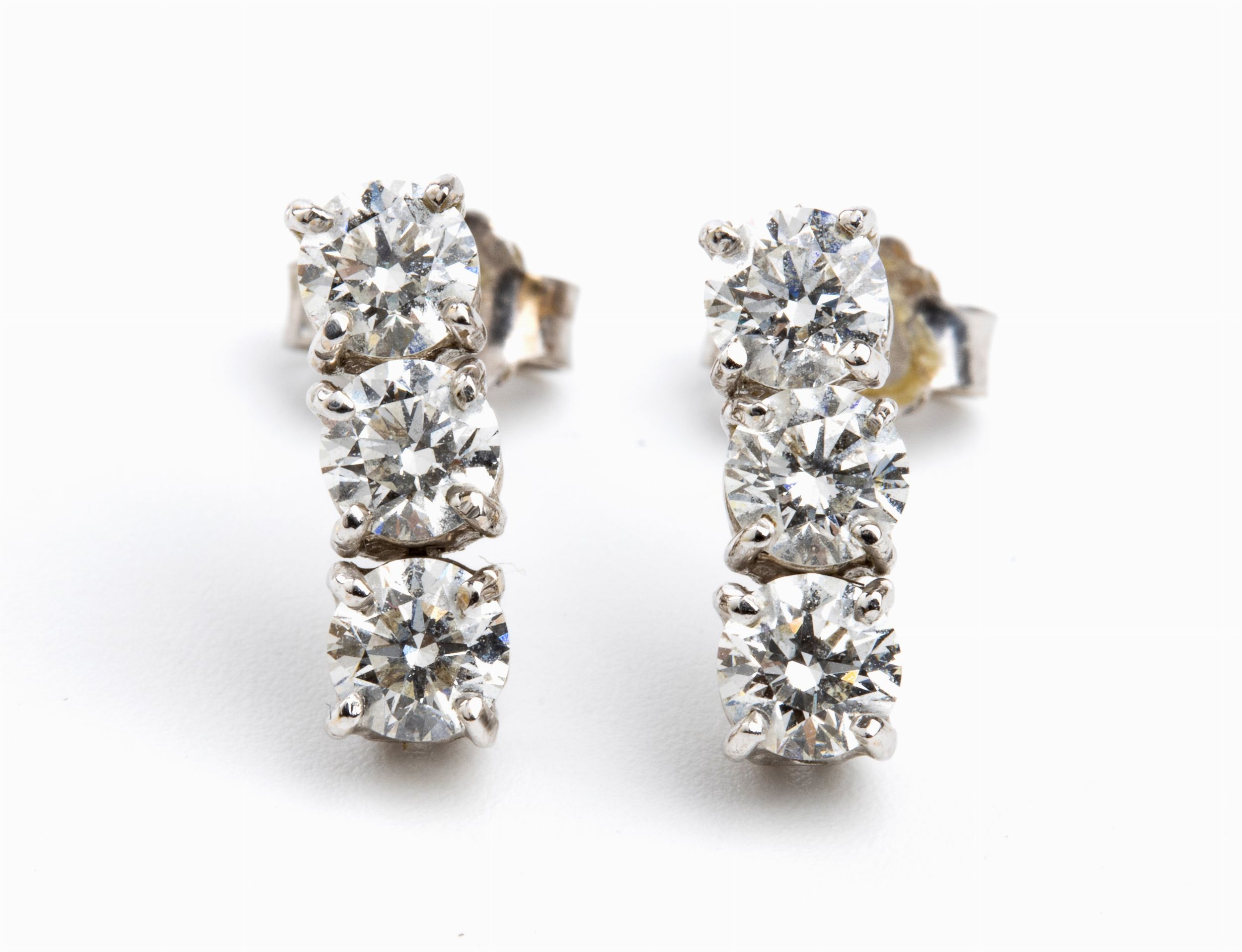 n. 06 diamanti, forma rotonda, taglio brillante, circa 1.20 ct, F-G, IF-VVS. Punzonati '750'. Lunghezza: 1,5 cm. Peso complessivo: 2,3 gr. Stato di conservazione: ***** eccellente.