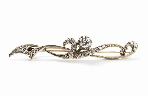 con motivo di nastri in diamanti. N. 01 diamante di forma rotonda, taglio brillante, circa 0.45 ct, I-J, VS. N. 27 diamanti di forma rotonda, taglio brillante e huit-huit, 0.90 ct circa, H-I, VS-SI. Lunghezza: 6.5 cm. Peso: 7.7 gr. Stato di conservazione: **** buono.