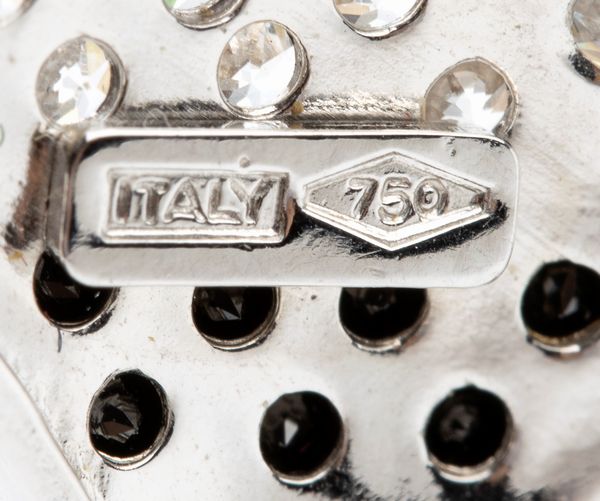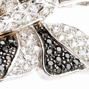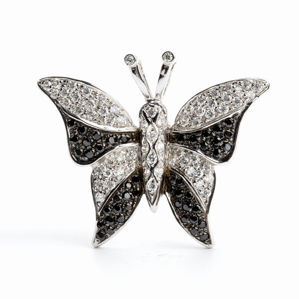 in oro bianco 18k, raffigurante una farfalla dal corpo ed ali decorate con pavè di paste vitree e moissanite nera. Punzonato 'ITALY - 750'. Dimensione: 4.2 x 3.5 cm. Peso: 12.6 gr. Stato di conservazione: ***** eccellente.