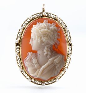 cammeo su conchiglia raffigurante profilo femminile in costume ed acconciatura classica, montatura traforata in oro giallo decorata da piccole perle. Dimensioni 4,7 x 3,7 cm. Peso 18,3 gr. Stato di conservazione: ***** eccellente.