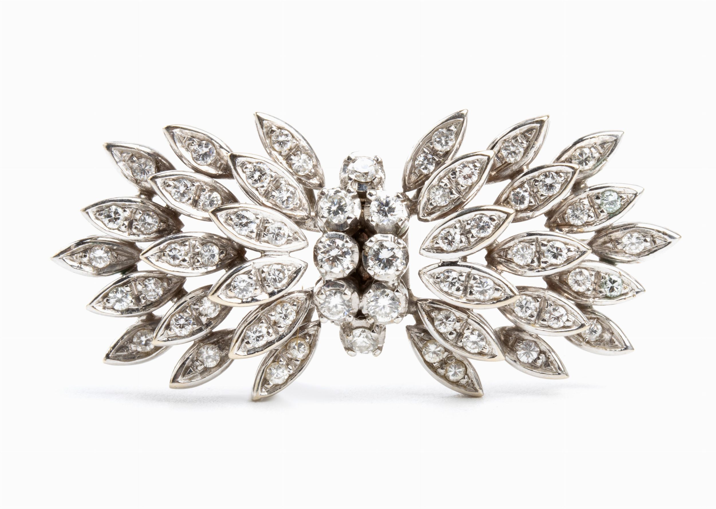 in oro bianco 18k a forma di fiocco, con motivo di foglie impreziosite da n. 72 diamanti di forma rotonda, taglio brillante, circa 1.50 ct, F-G, VVS-VS. Punzonata '750'. Dimensioni: 4,4 x 2 cm. Peso: 12,4 gr. Stato di conservazione: **** buono.