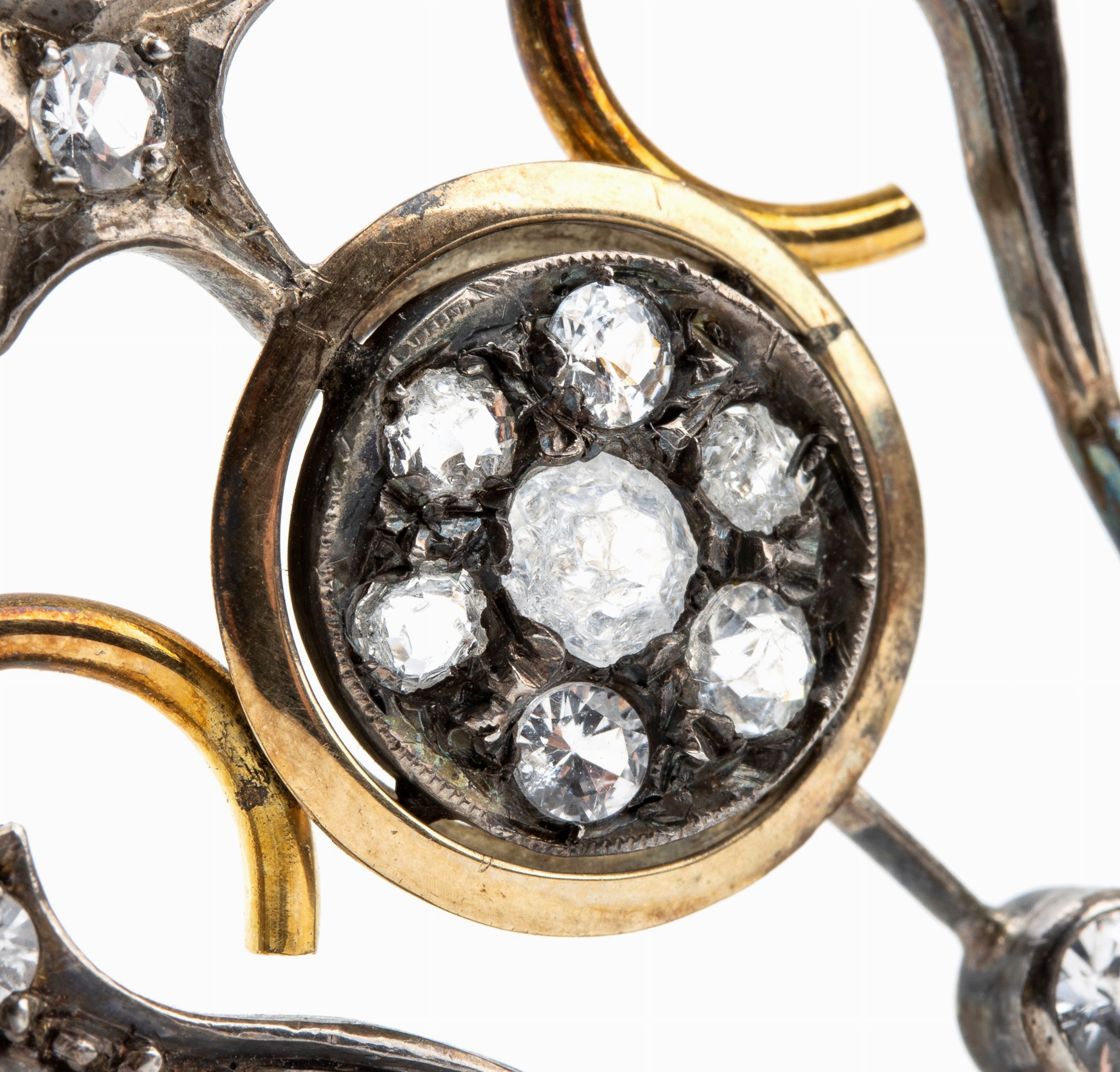 fine XIX secolo a motivo di volute di nastri con rosone centrale e dettagli in paste vitree. Dimensioni: 5 x 4 cm . Peso: 9.1 gr. Stato di conservazione: **** buono.