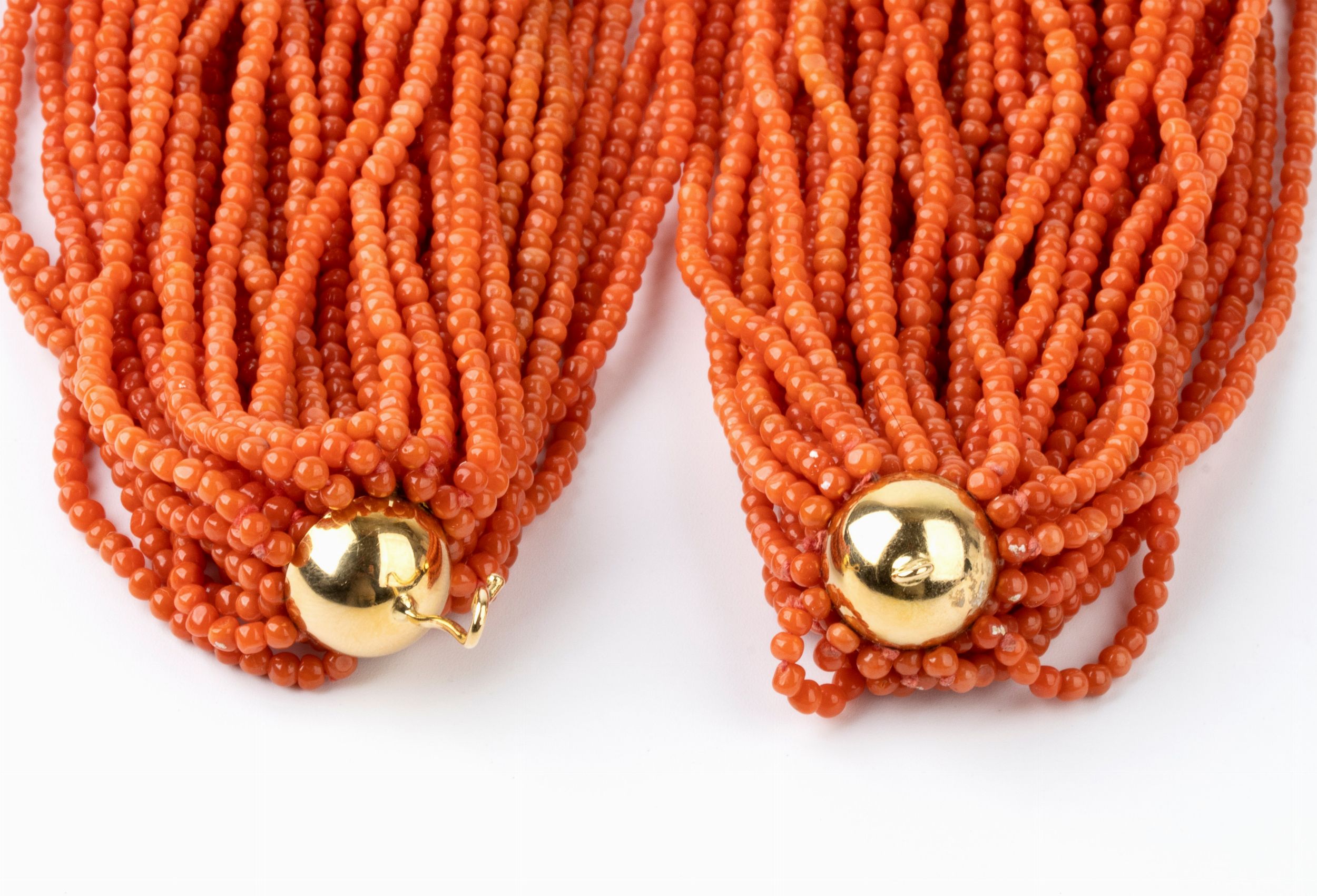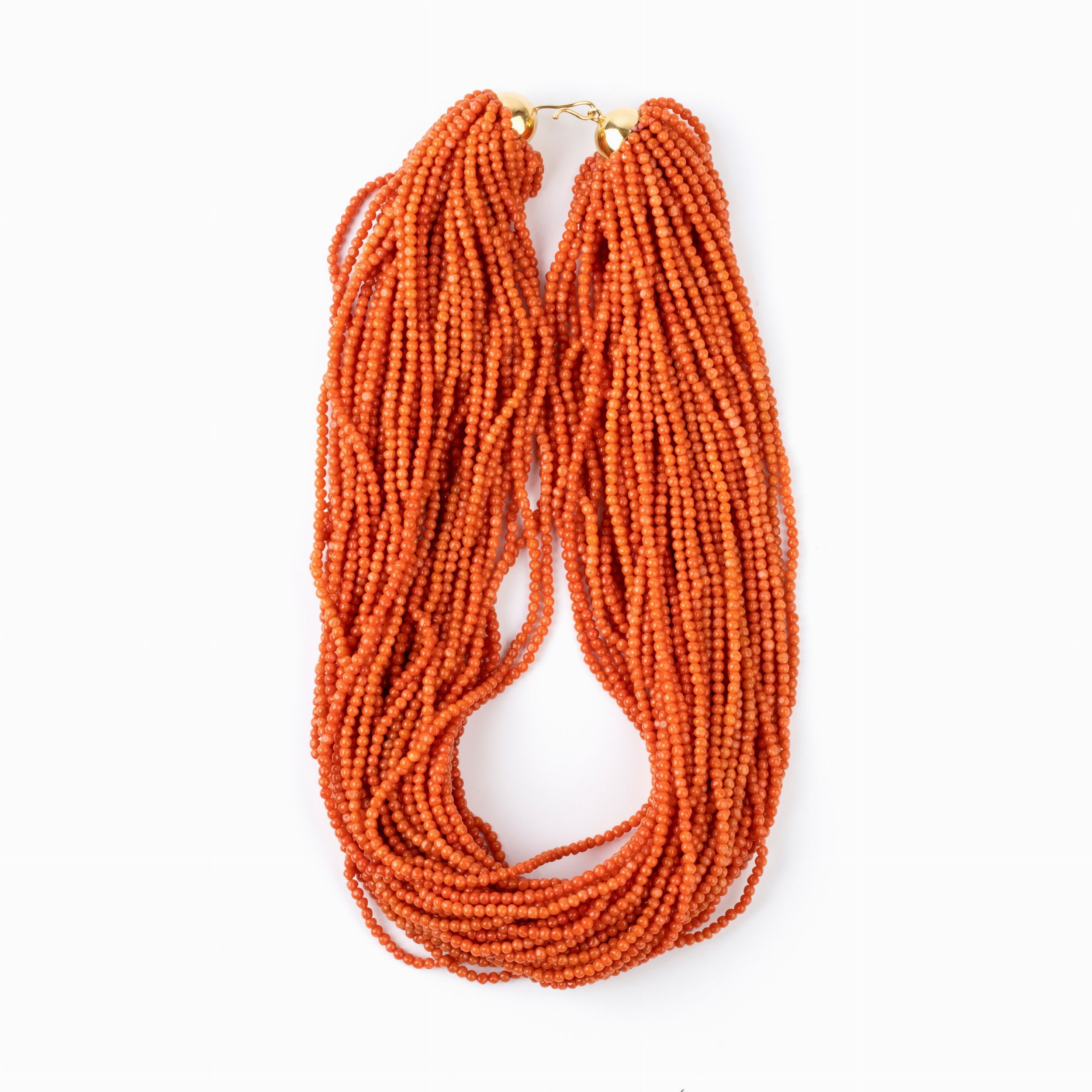 a 48 fili di piccole sfere di corallo Mediterraneo (Corallium Rubrum) con fermezza in oro giallo 18k.  Diametro corallo: 3 - 3.5 mm. Lunghezza: 50 cm.  Stato di conservazione: **** buono.