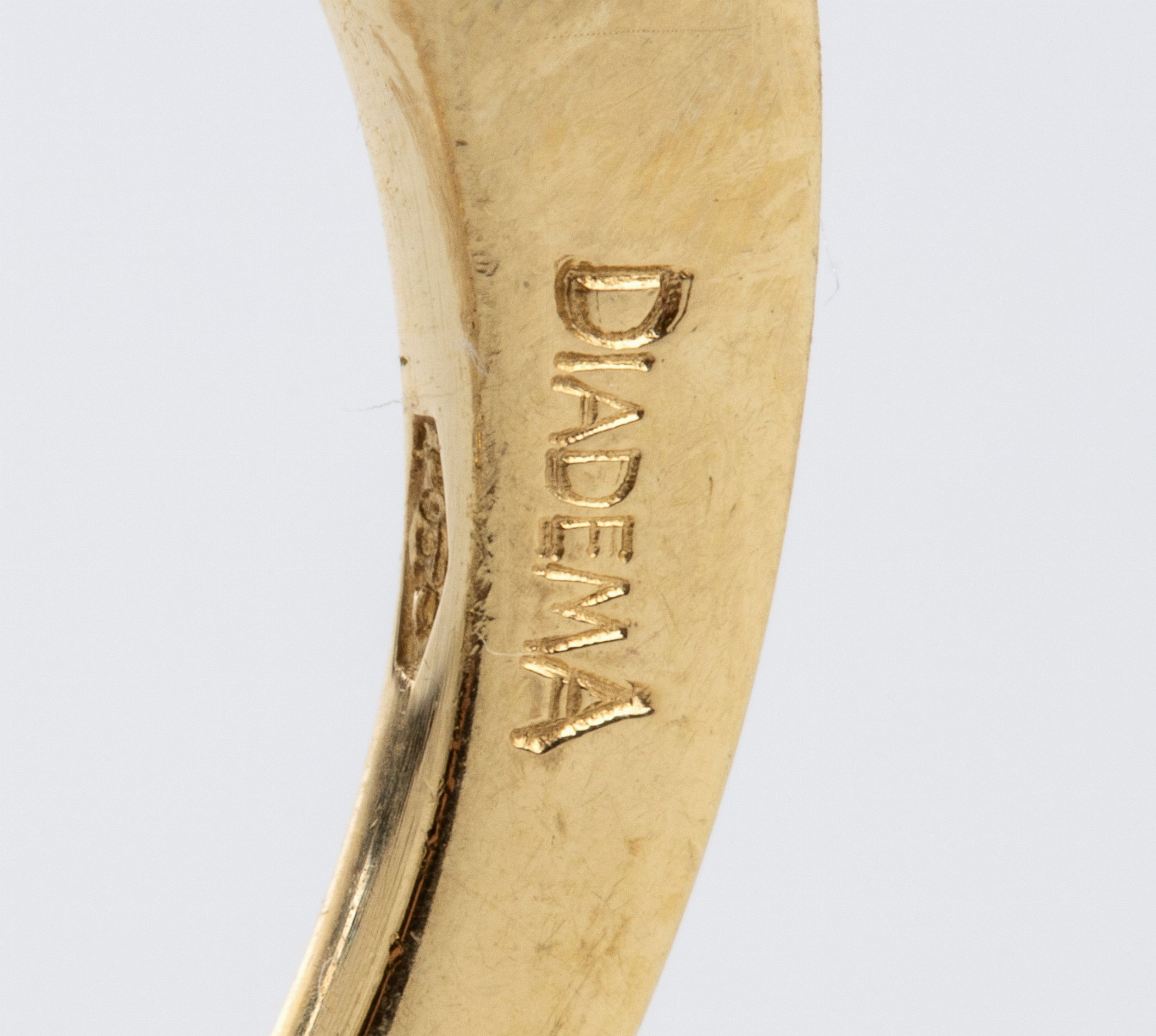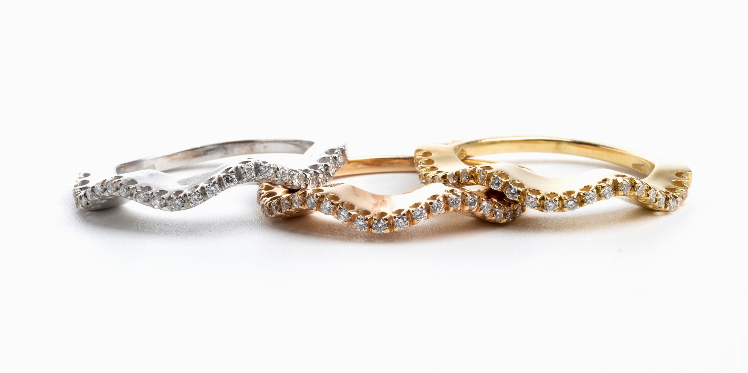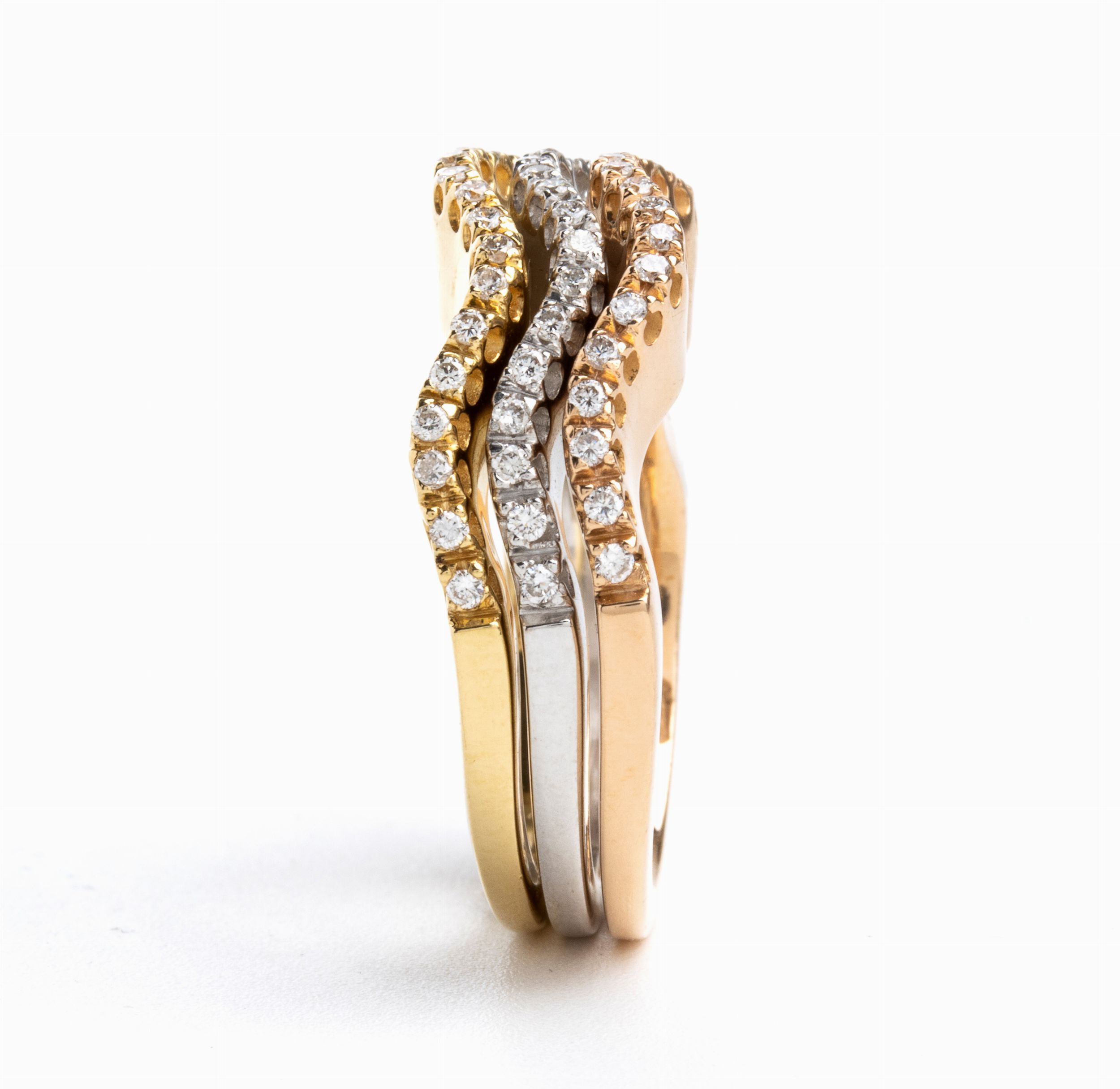 in oro bianco, giallo e rosa 18k, ciascuno con motivo a onda, incastonati con n. 69 diamanti di forma rotonda, taglio brillante, circa 0.60 ct, H-I, VS-SI. Punzonati' 750 - DIADEMA - 945 AL'. Misura ITA 12 - Misura USA 6. Peso: 14,2 gr. Stato di conservazione: **** buono.
