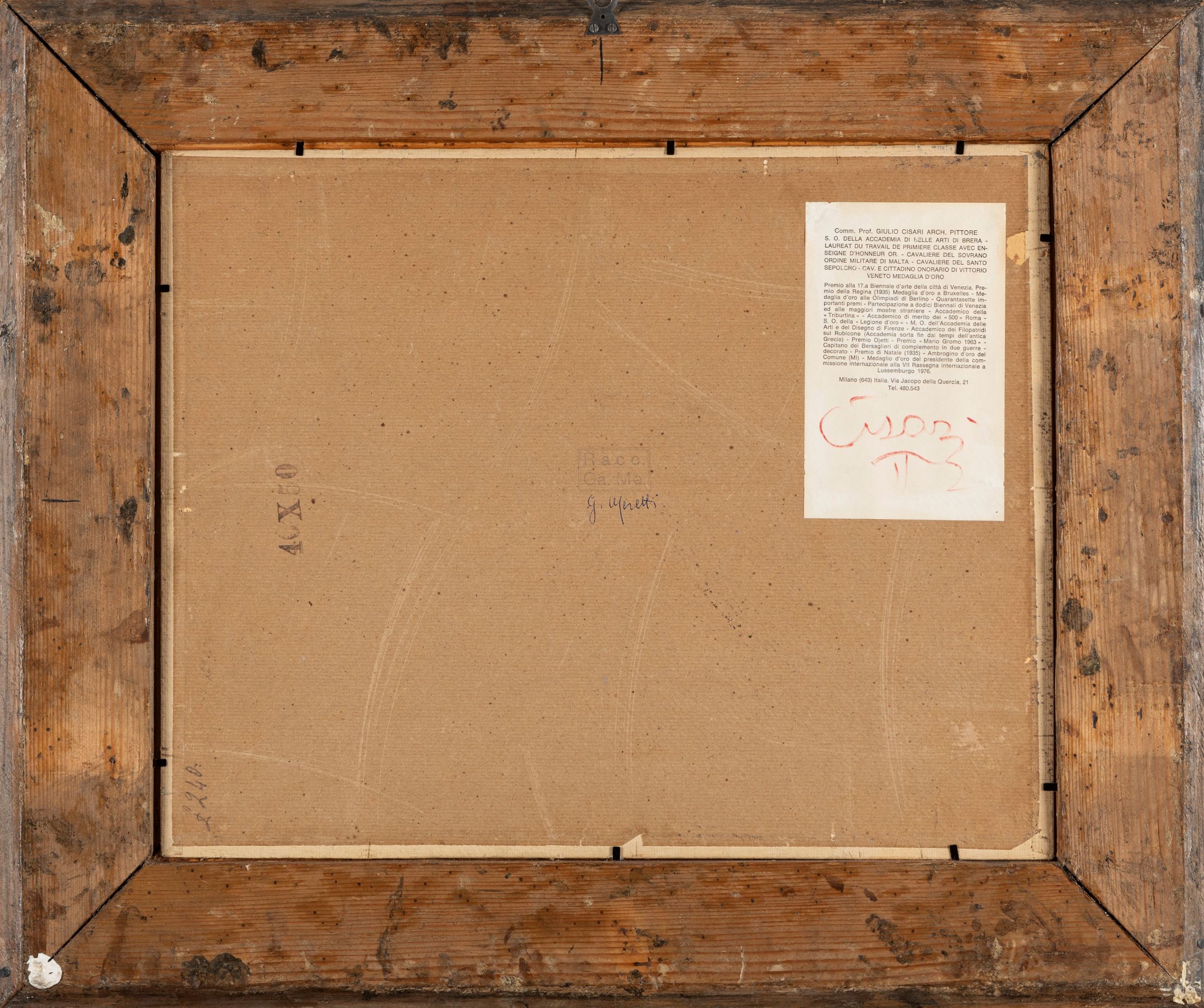 al retro, sul cartone, etichetta del pittore con firma