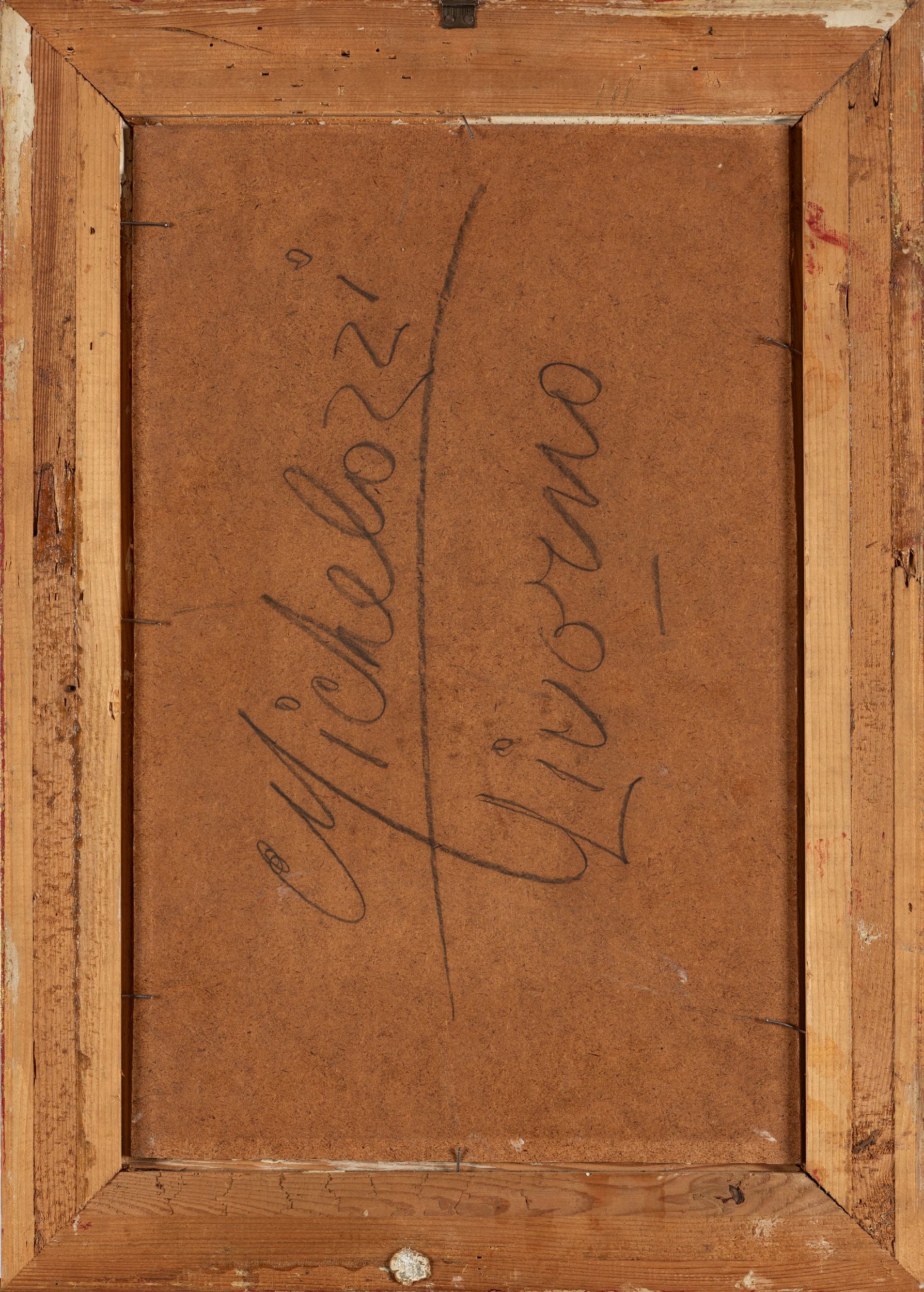 firmato in basso a sinistra al retro, firmato sulla masonite: Michelozzi Livorno