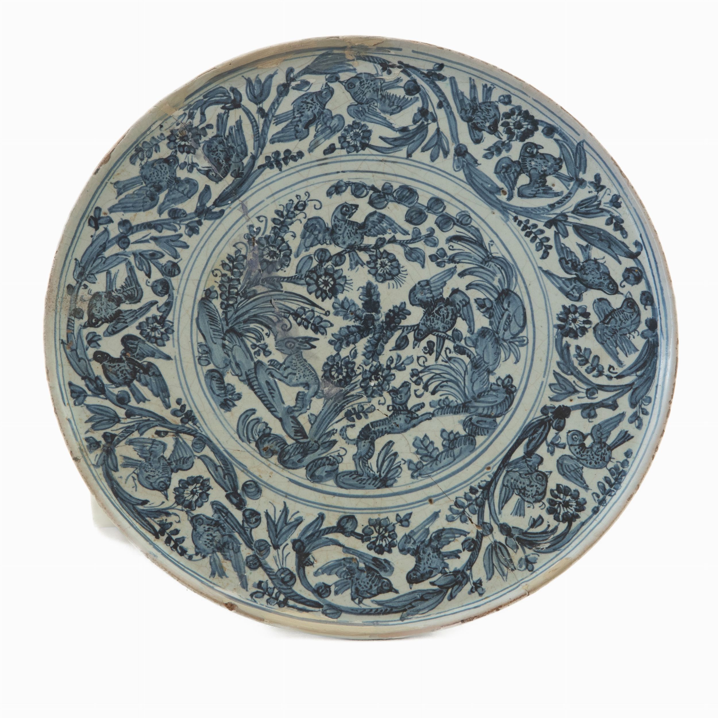 diametro 24,7 x 5,7 x 9,7 dall'orlo tondo liscio leggermente rialzato, con piede circolare a campana e dal corto collo. Decoro ' calligrafico naturalistico ' in blu su fondo bianco. Deruta , Maestro del calligrafico, seconda metà XVII secolo Condizioni: restauri e rifacimenti