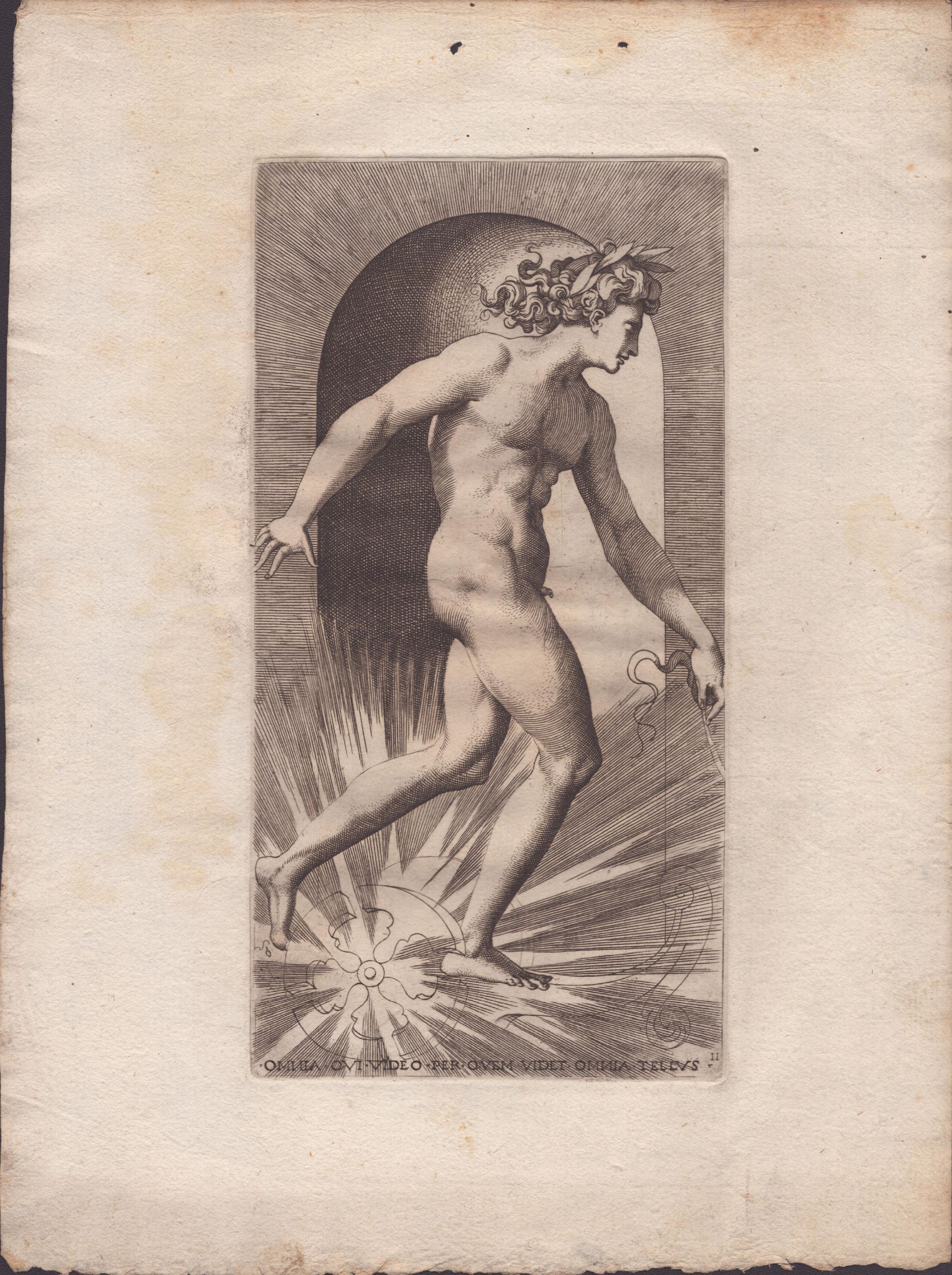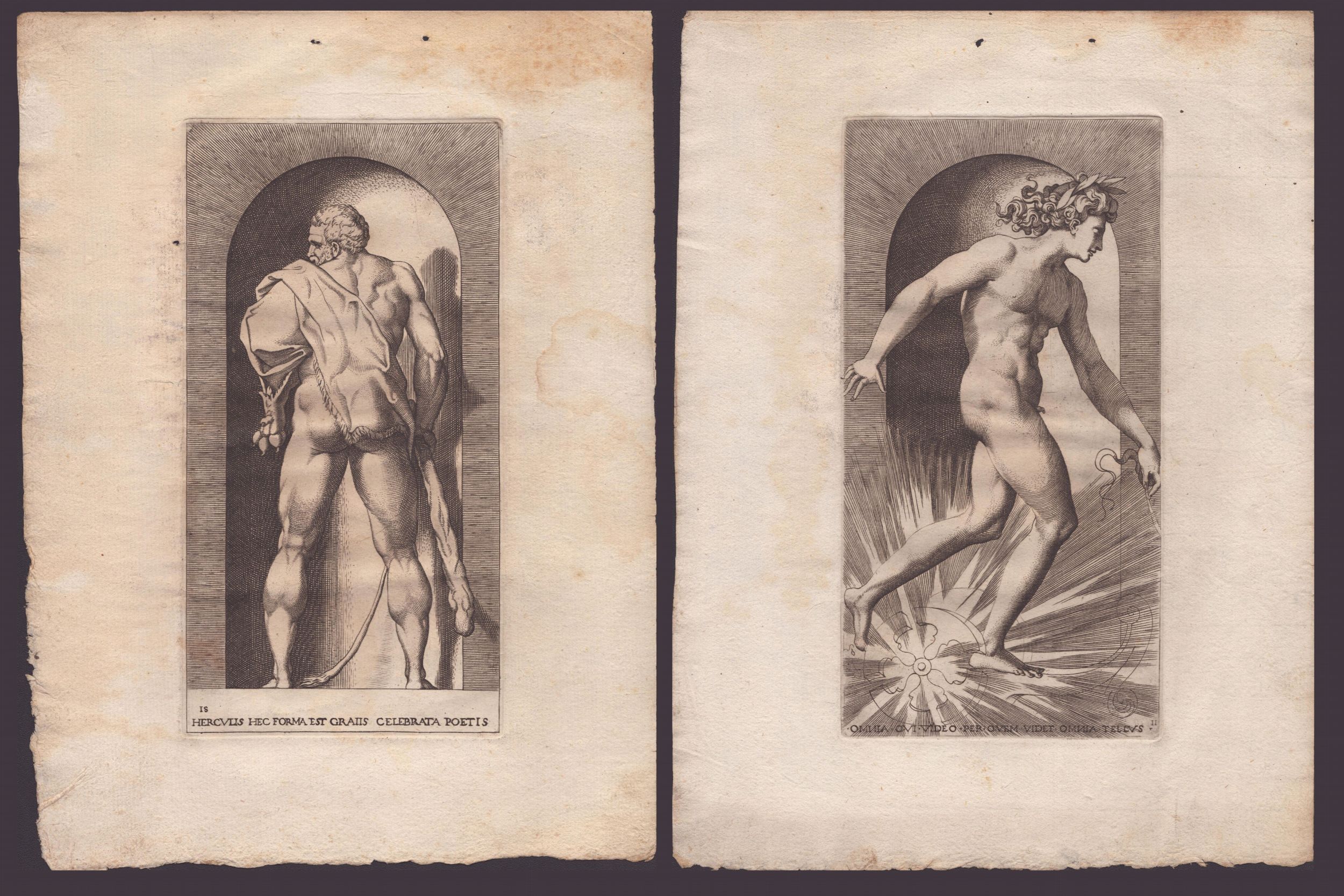 da Rosso Fiorentino, con i ritocchi di Francesco Villamena. Bulino, 205 x 111 mm e 213 x 110 mm (lastra), 295 x 220 mm ca (foglio). Dalla serie di 20 incisioni con le divinità mitologiche, stato III/III, ritoccato da Villamena, sopratutto nella parte dei bordi attorno alle nicchie, ricoperti di tagli. B.XV.78.34.11 e 15. Belle, nitide impressioni su carta vergata con frammenti di filigrana (fleur-de-lys entro doppio cerchio). Fogli in condizioni molto buone ma con leggeri segni di ossidazione e qualche foro. 'Ercole' con una macchia sul margine destro e un breve strappo sul margine sinistro.
