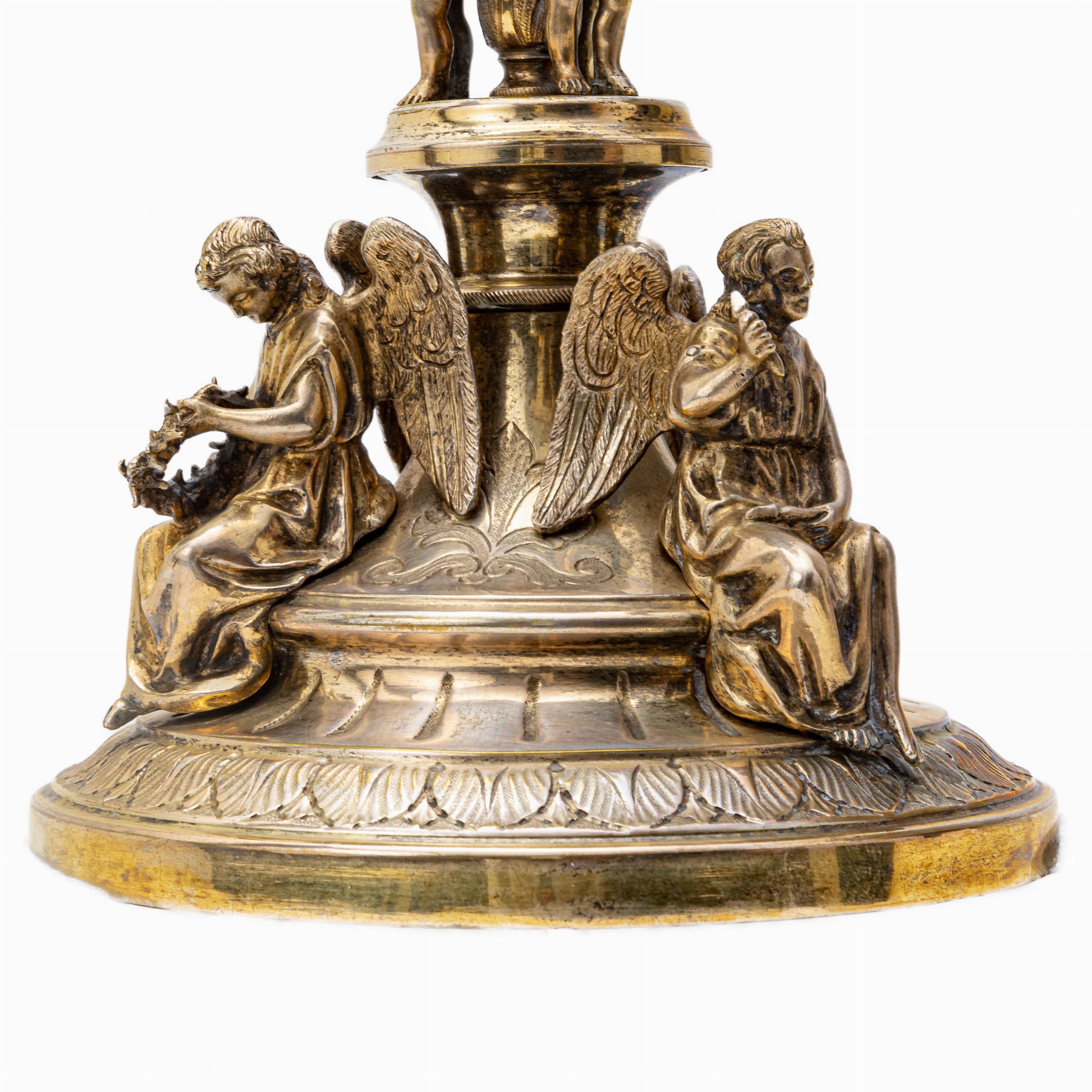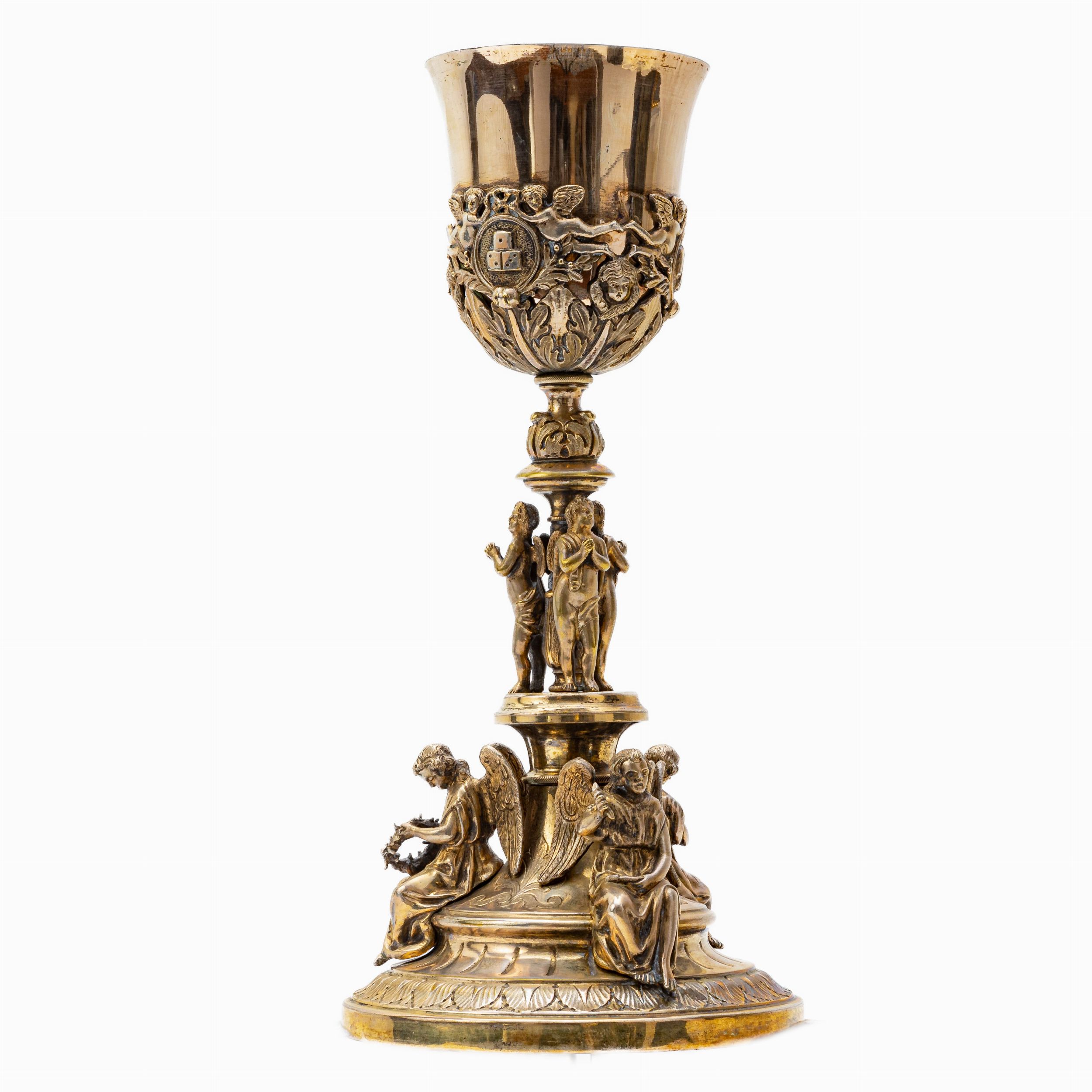 XX secolo di forma Barocca, con angeli alla base e lungo il corpo ed elementi floreali scolpiti ed incisi dal bicchiere alla base