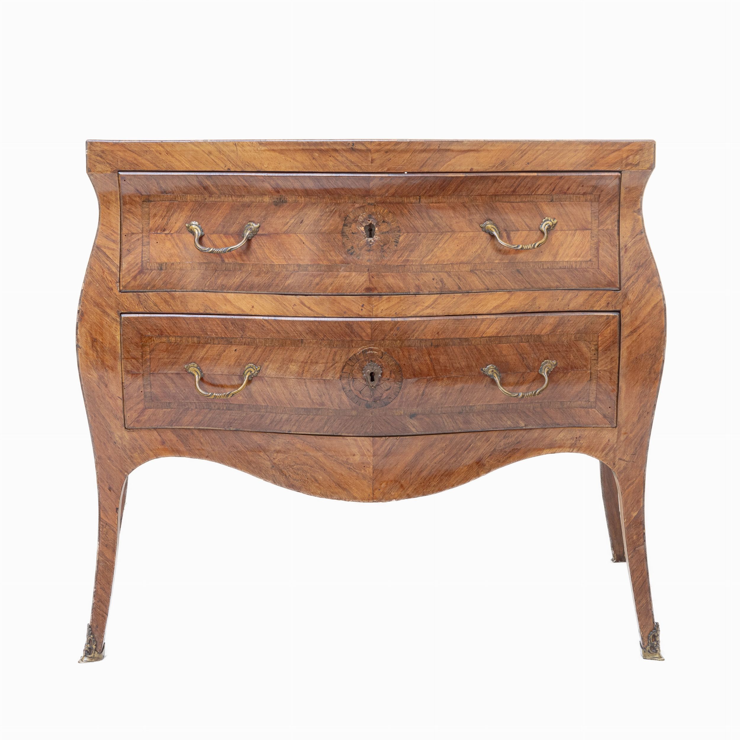 89 x 104 x 61 cm prima metà XX secolo fronte e fianchi bombati, quattro gambe a virgola, quadrifogli a tarsie entro riquadrature geometriche sul piano e sui fianchi. Condizioni: difetti e mancanze