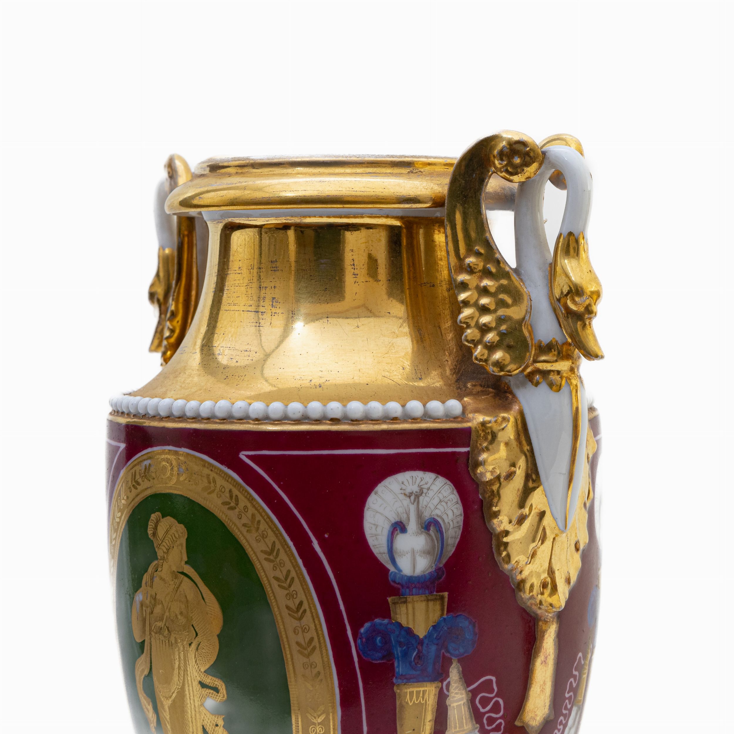 26 x 8 x 8 cm Francia, metà XIX secolo corpo ad urna terminante dal piede tondo perlinato su base quadrata. Collo ad imbuto con coppia di prese a cigno. Decorazioni a riserve su fondo rosso con profili mulieri e festoni di frutta. Collo, piede a finiture in oro zecchino.