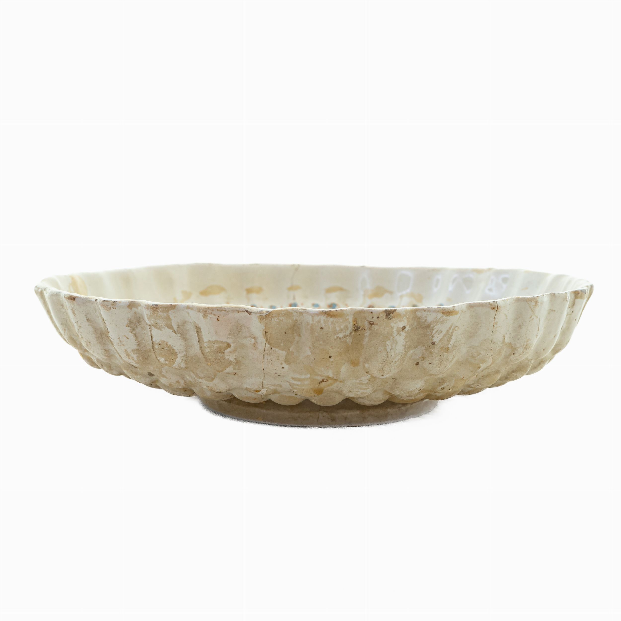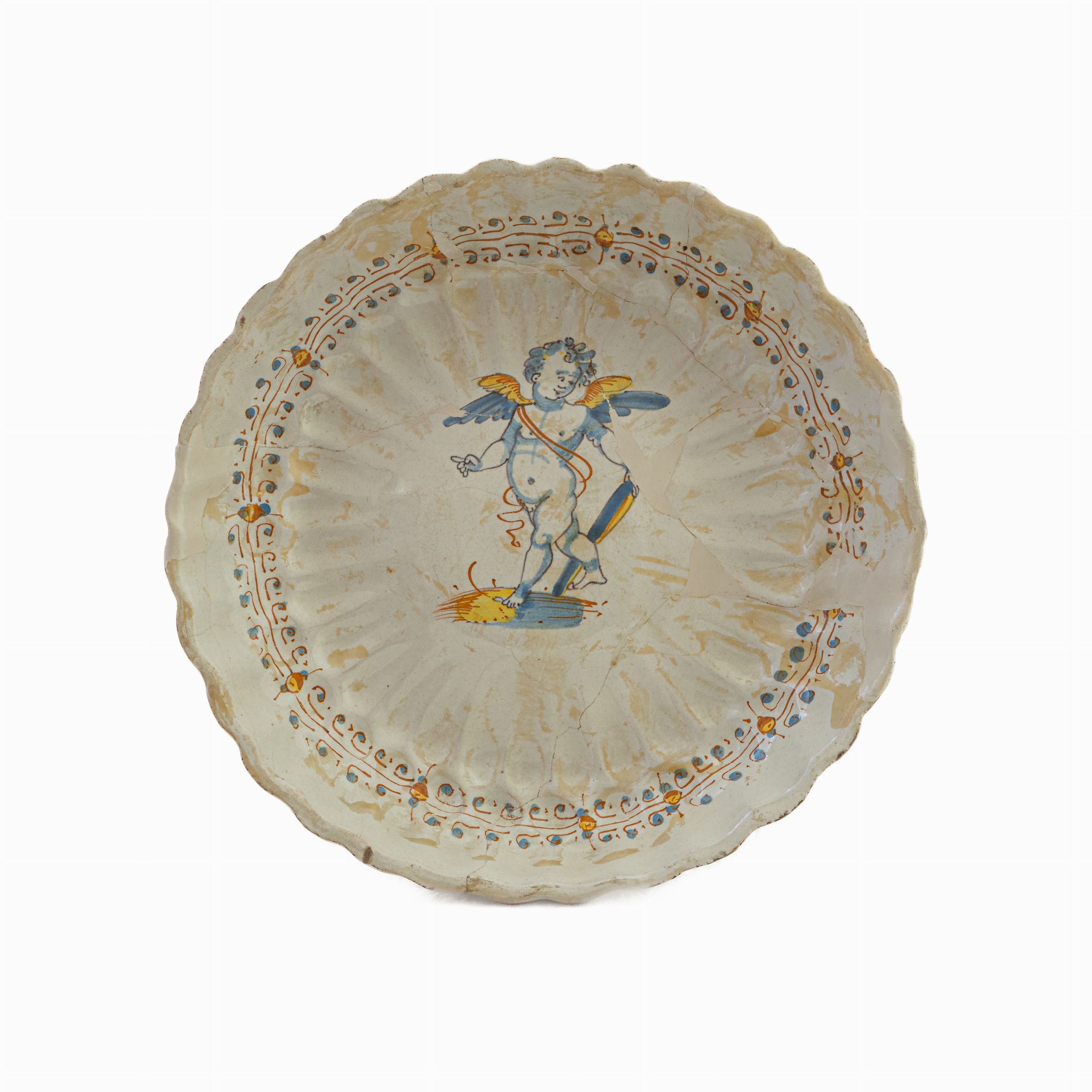 24,5 x 6 x 10 cm Deruta, primo quarto del XVII secolo bordo mistilineo con baccellature che partendo dall'orlo arrivano al centro del piatto. Parte centrale rialzata dal corpo ceramico e piede d'appoggio ad anello su corto collo. Decoro a putto alato nelle cromie blu, giallo e arancio su fondo bianco con cintura stilizzata floreale tra l'alzata dell'orlo e la base del piatto. Condizioni: restauri e rifacimenti.