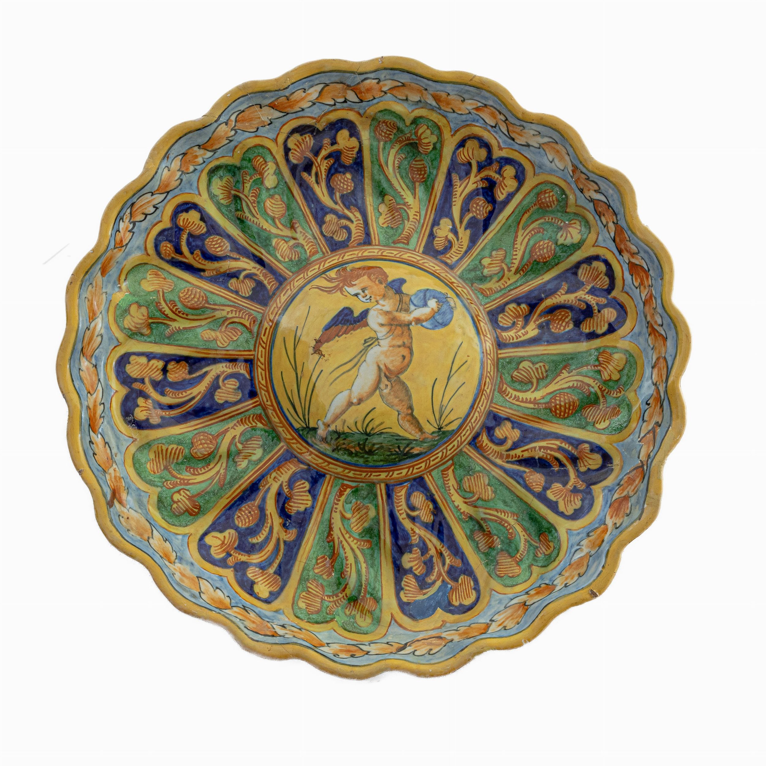27 x 5 cm fine XIX secolo inizi XX secolo dall'orlo mistilineo da cui scendono le costolature che terminano nel centro del piatto fortemente umbonato. Decoro policromo a fasce verticali con elementi floreali. Umbone con scena di putto danzante su fondo ocra, firmato ala retro in blu sotto smalto, manifattura Penazzi Bagnocavallo Condizioni: restauri