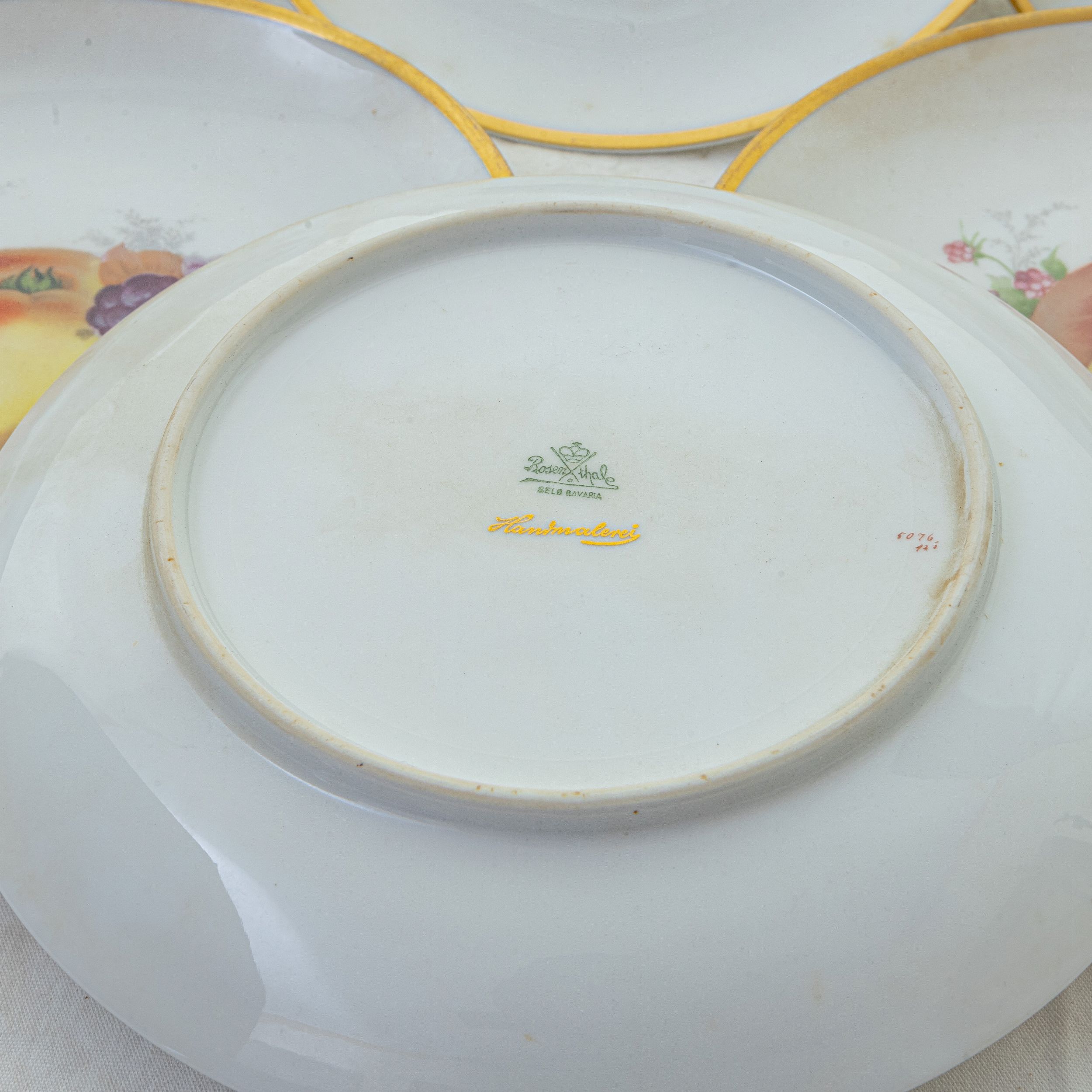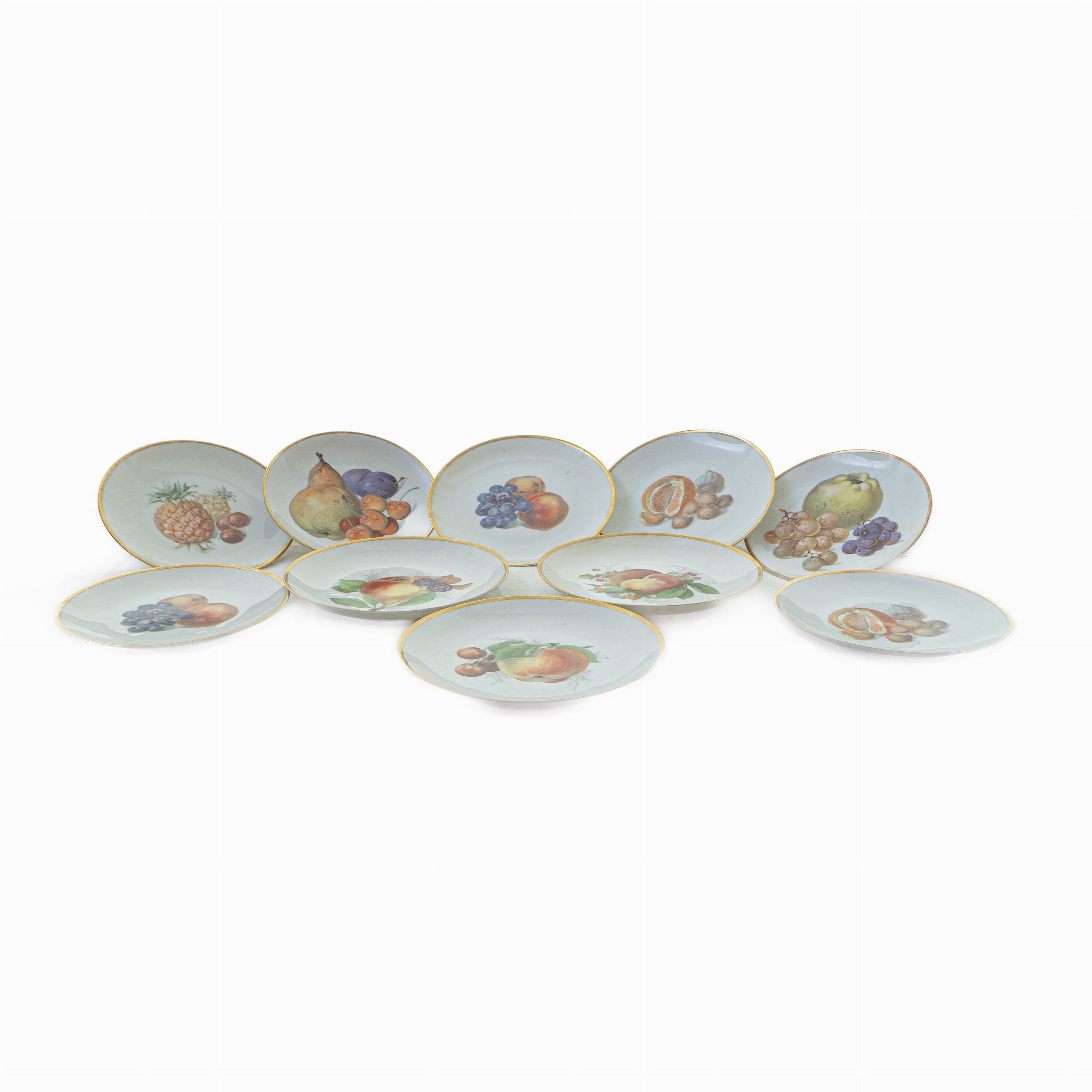 in porcellana in tre diverse misure con decoro a frutta su fondo bianco ed orlo rifinito ad oro zecchino. Manifatture tedesche , seconda metà XX secolo